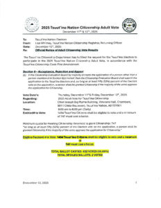 Here are the Tsuut’ina Citizenship 2025 Adult Vote Results as of December 12th, 2025.