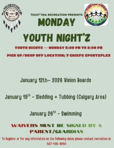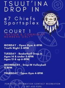 Please see the attached posters for the 2026 Recreation Programs. For more information, contact Tsuut’ina Recreation at 587-435-9290.