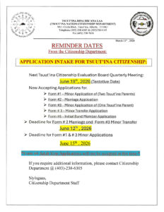 Please see the attached notice regarding the Application Intake for Tsuut’ina Citizenship.