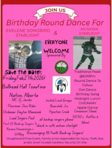 Please see the attached poster and message for the Birthday Round Dance for Evelene Songbird Starlight & Muskwa Starlight happening Friday, February 27th, 2026, at Bullhead Community Hall: