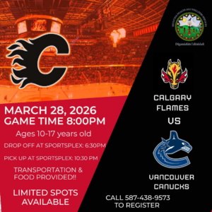 Tsuut’ina Health & Wellness Services is excited to take youth to the Calgary Flames vs Vancouver Canucks game on March 28, 2026.