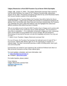 Please see the attached press release for the 2025 Founder Cup. Calgary Shamrocks will host 2025 Founders Cup at 7 Chiefs Sportsplex & Chief Jim Starlight Centre from August 18th – 24th, 2025.
