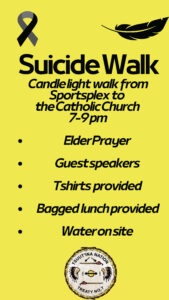 Please see the attached information for the Suicide Walk – Candlelight Walk from the 7 Chiefs Sportsplex & Chief Jim Starlight Centre to the Catholic Church on September 25th, 2025, from 7 PM – 9 PM.