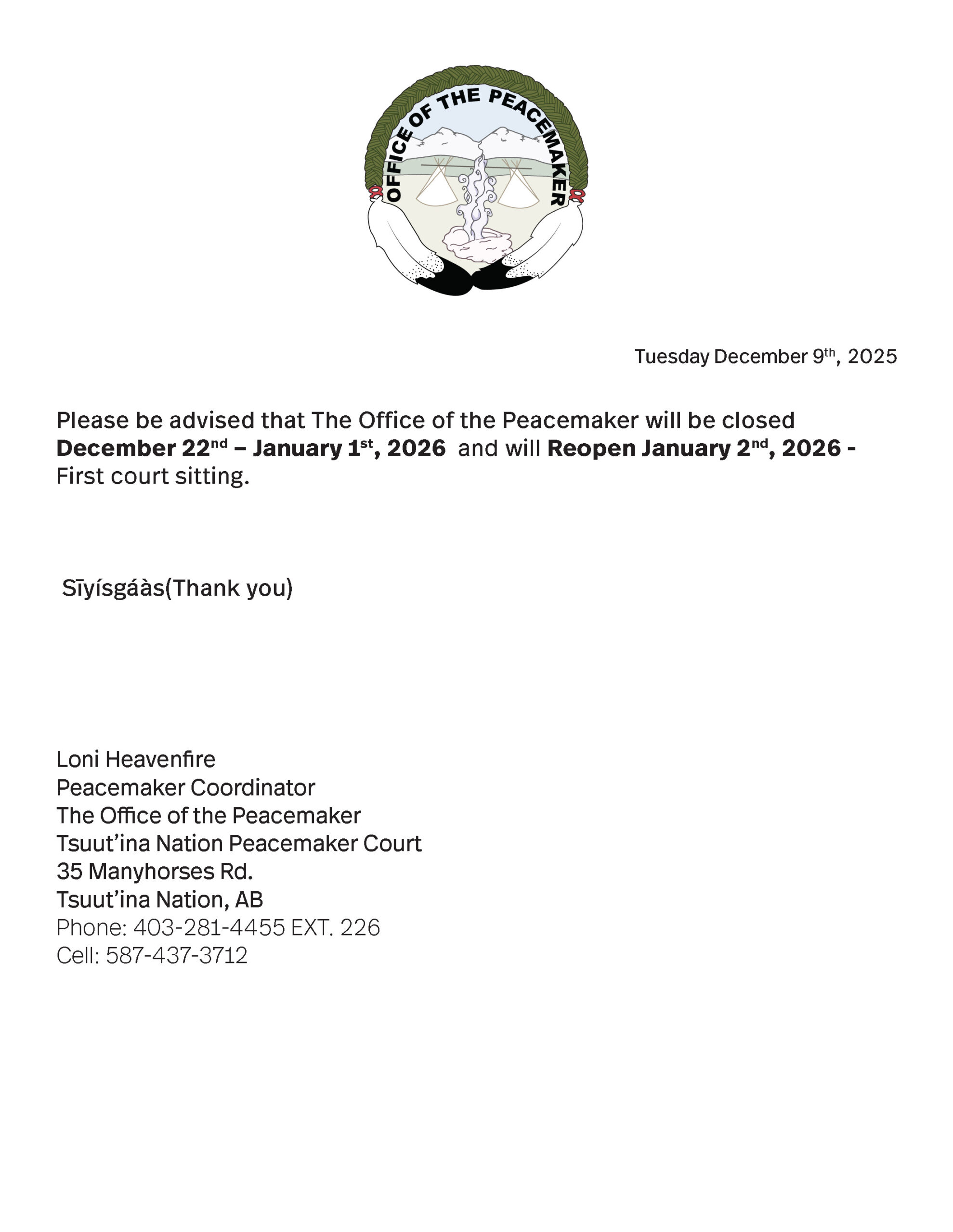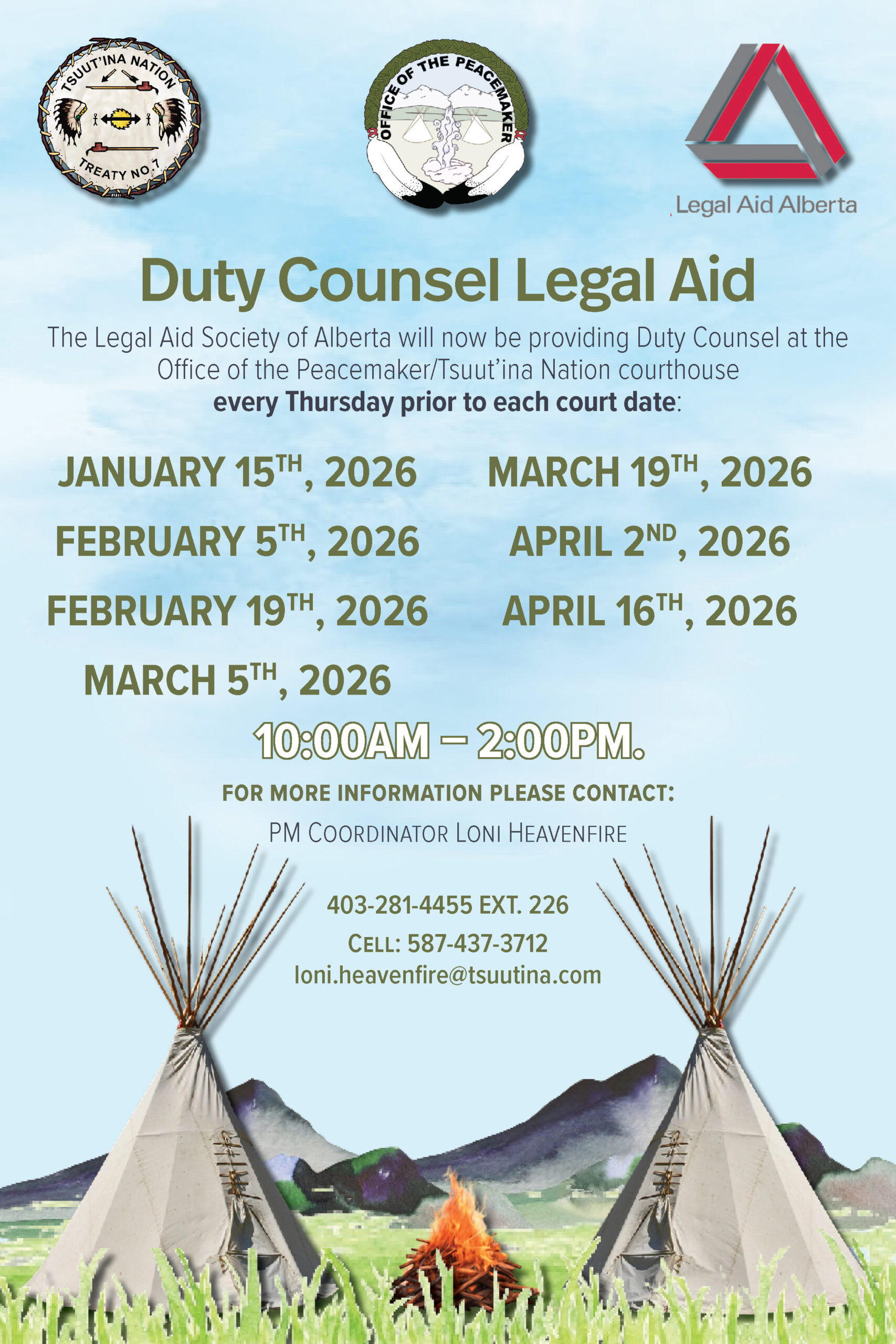 Gújá nágúdīgòy(Good morning), Please see the attached schedule for Duty Counsel Legal Aid starting January 15th – April 16th, 2026, from 10 ...