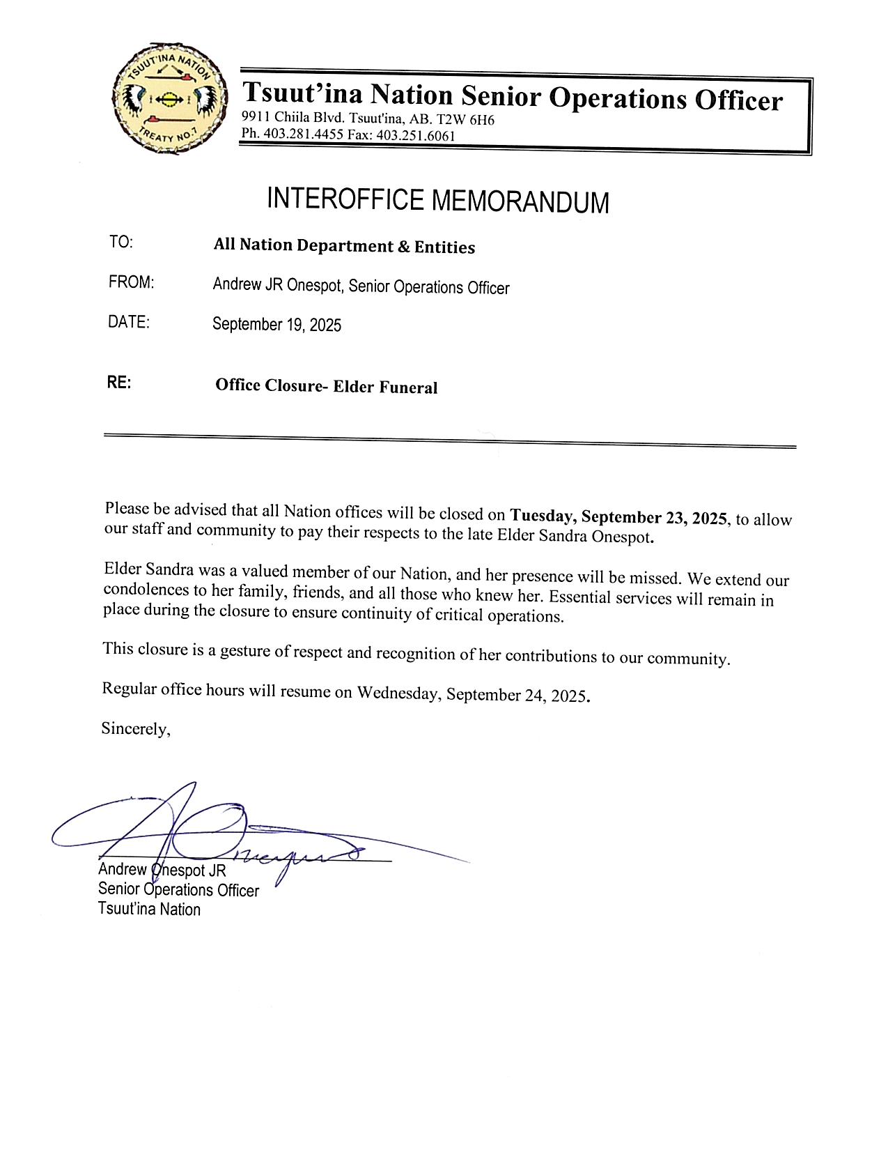 Dzīnísī gújā(Good day), Please be advised that all Nation Offices will be closed on Tuesday, September 23rd, 2025, to allow our staff ...