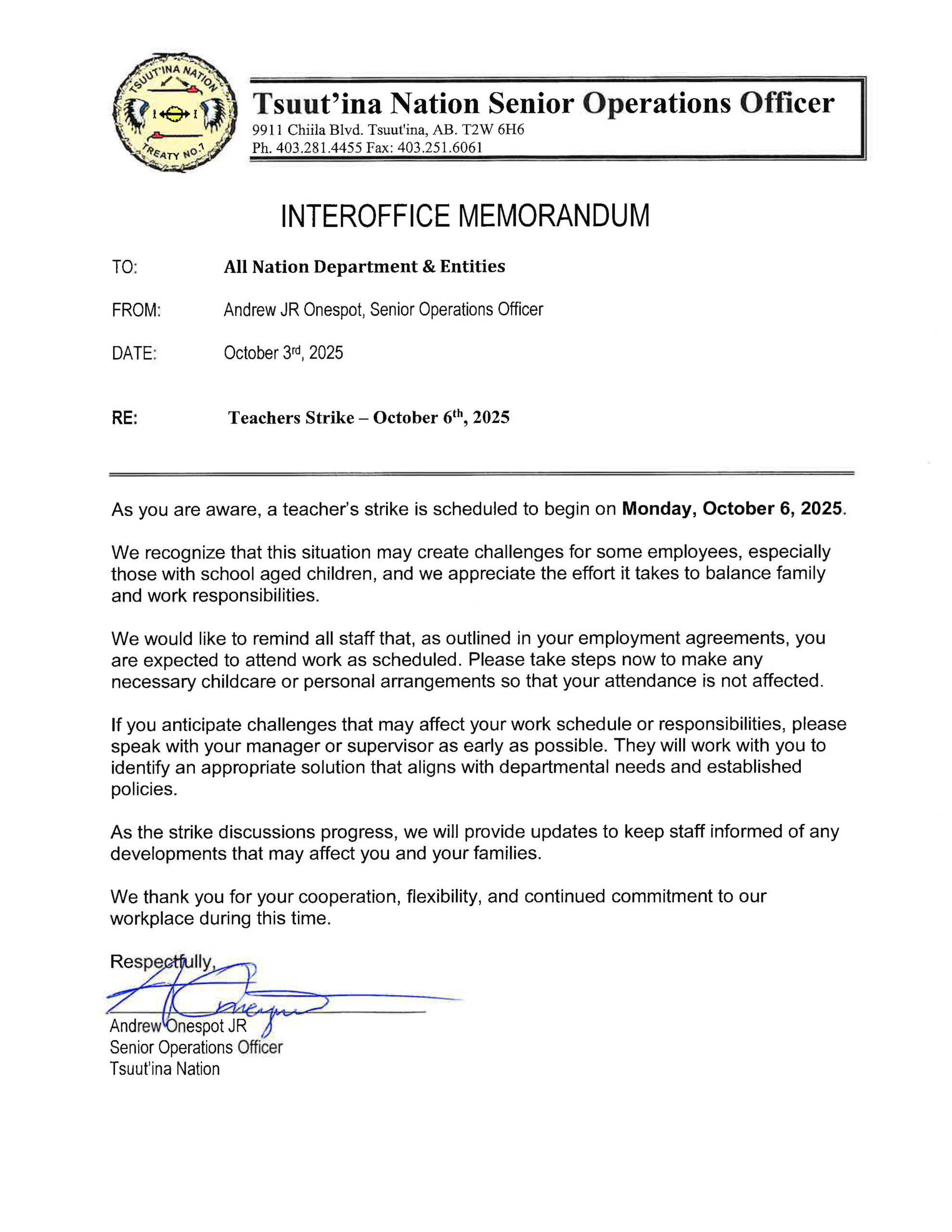 Dzīnísī gújā(Good day), Please see the attached memo regarding the Teachers Strike – October 6th, 2025. Teacher Strike – edit – Oct 6 2025 Sīyísgá...