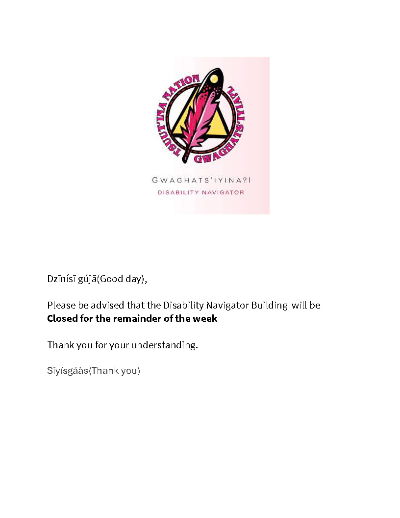 Gújá nágúdīgòy(Good morning), Please be advised that the Disability Navigator Building will be closed for the remainder of the ...