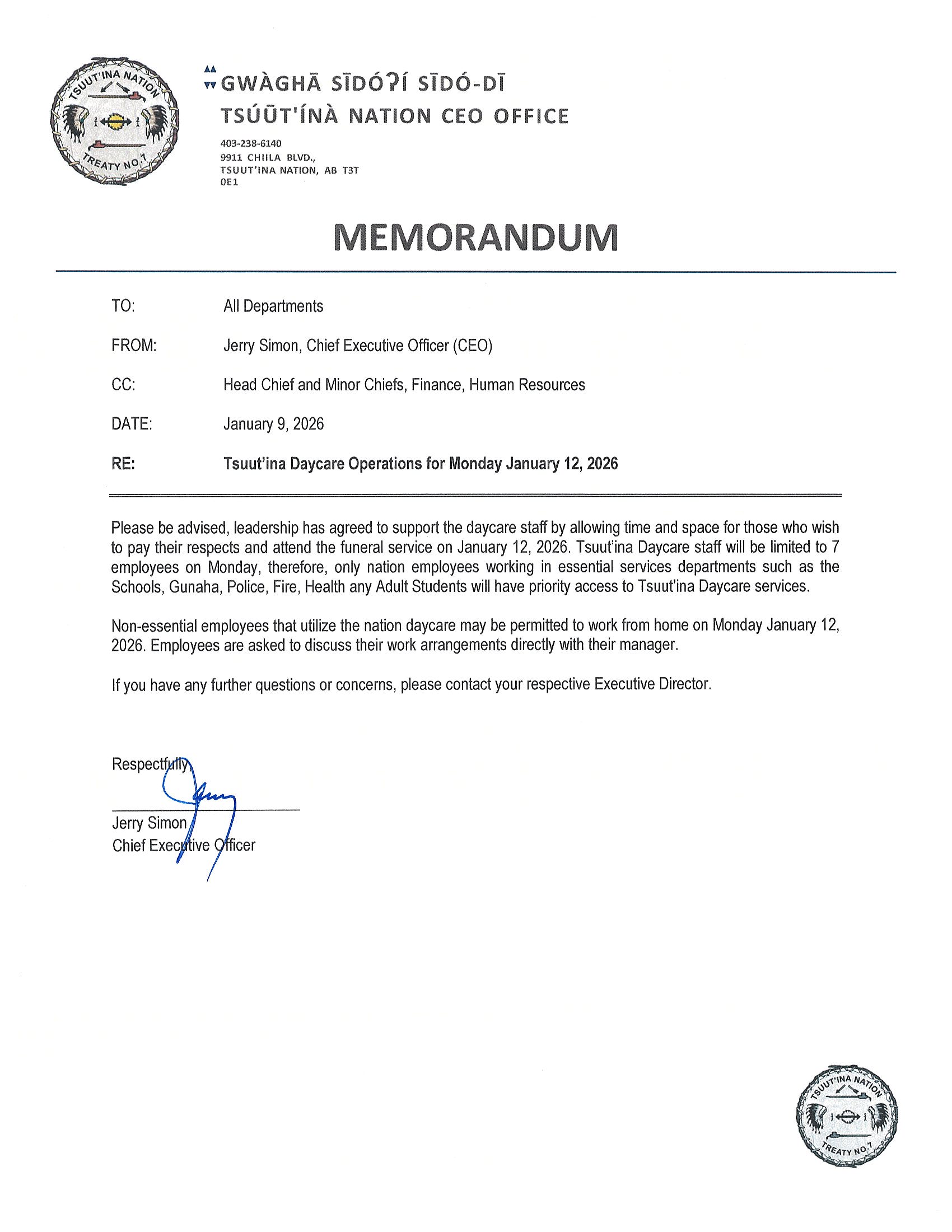 Dzīnísī gújā(Good day), Please see the attached memo regarding Tsuut’ina Daycare Operations for Monday, January 12th, 2026. TTN Daycare Operations for ...
