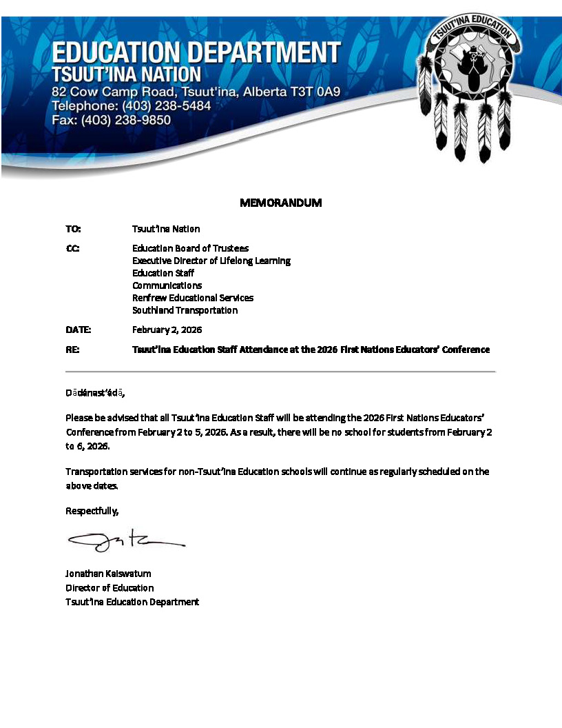 Diyí dzínisà Gújá Nágúdīgòy(Good morning), Please see the attached memo regarding Tsuut’ina Education staff attendance at the 2026 ...