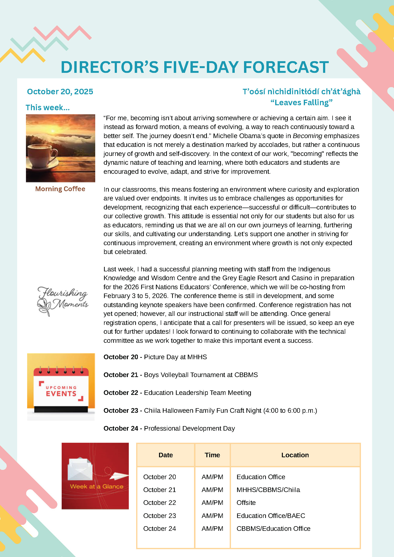 Gújá nágúdīgòy(Good morning), Please see the attached Education Director’s Five-Day Forecast – October 27, 2025. Director’s Five-Day Forecast – October 27, 2025 Sī...