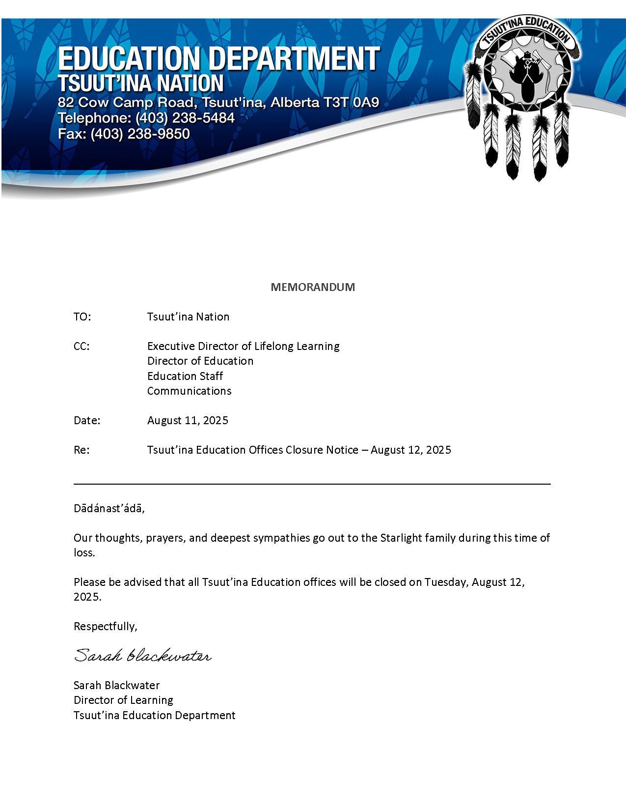 Dzīnísī gújā(Good day), Please see the attached memo from the Tsuut’ina Education Department regarding office closure on August 12th, 2025. Tsuut’...