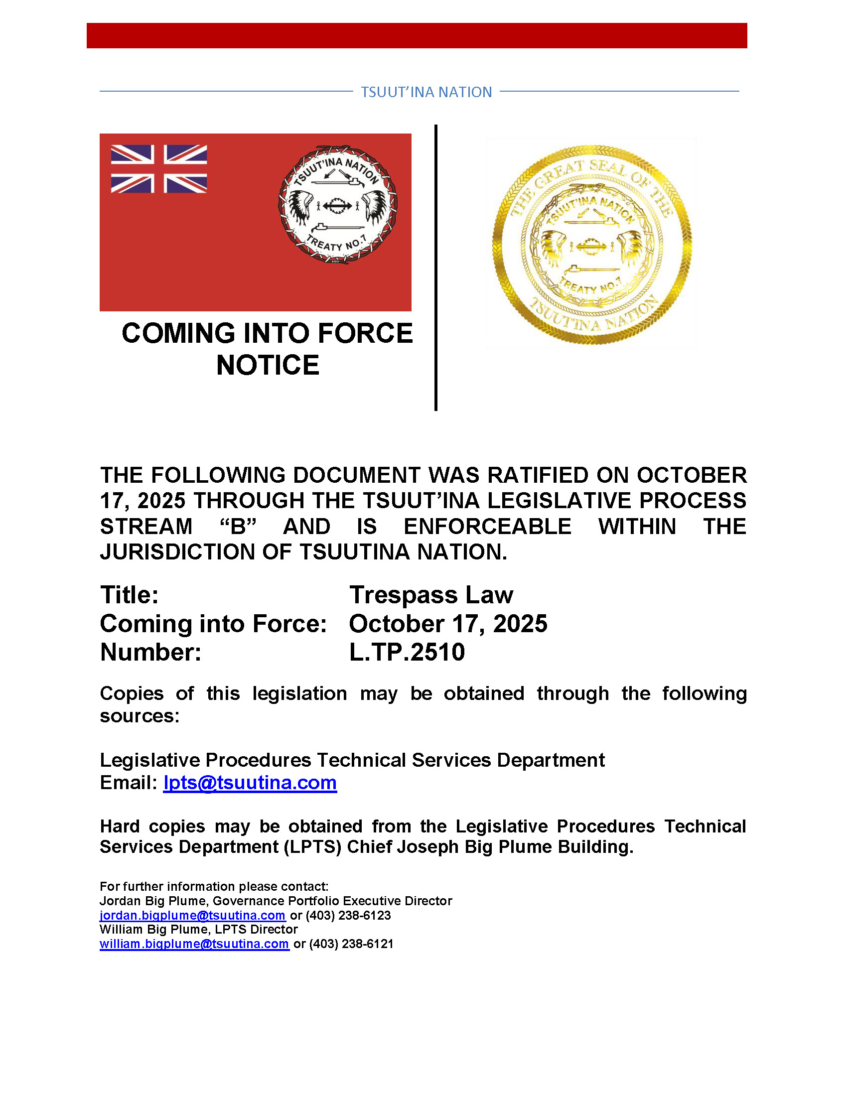 Gújá nágúdīgòy(Good morning), Please see the attached documents for the Trespass Law: Coming into Force Notice, BCR, and Information ...