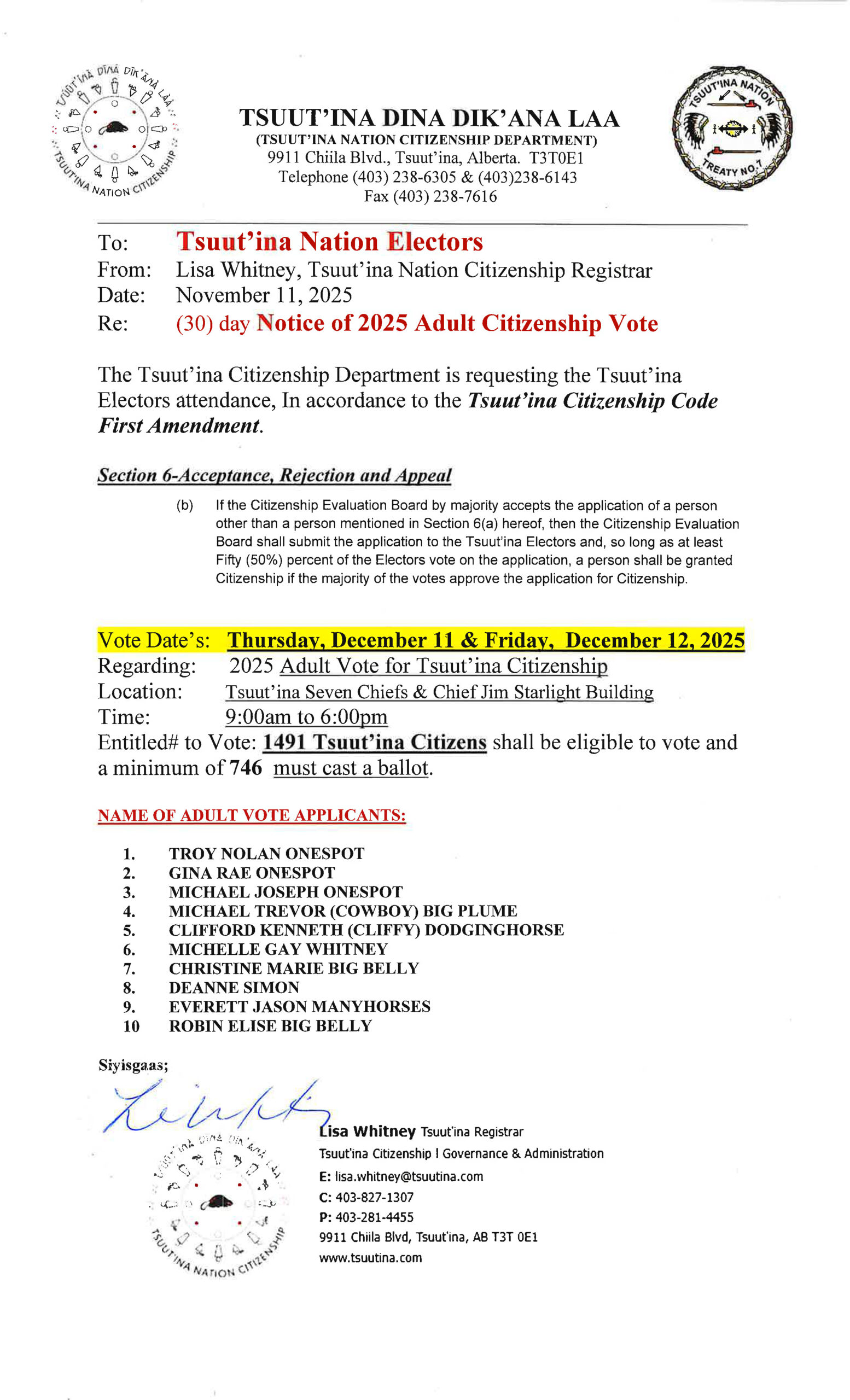 Gújá nágúdīgòy(Good morning), Please see the attached notice and profile forms for the 2025 Tsuut’ina Nation Adult Citizenship Vote. ...