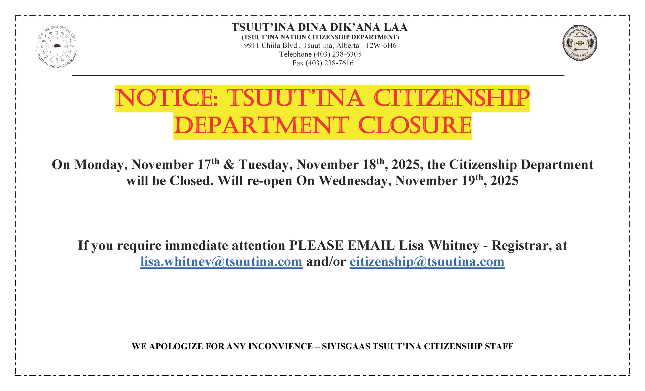 Dzīnísī gújā(Good day), Please be advised that the Citizenship Office will be closed on Monday, November 17th & 18th, 2025, and will ...