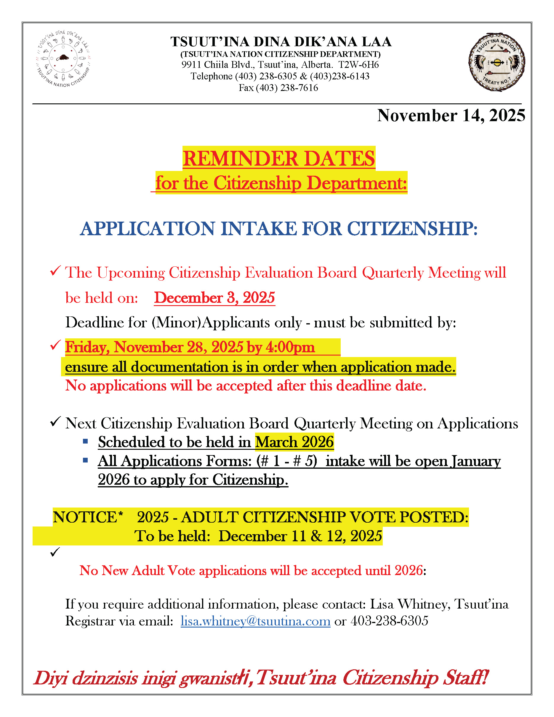 Dzīnísī gújā (Good day), Please be advised and review this notice: Tsuut’ina Citizenship Adult Vote – Thursday, December 11th, and Friday, December 12...