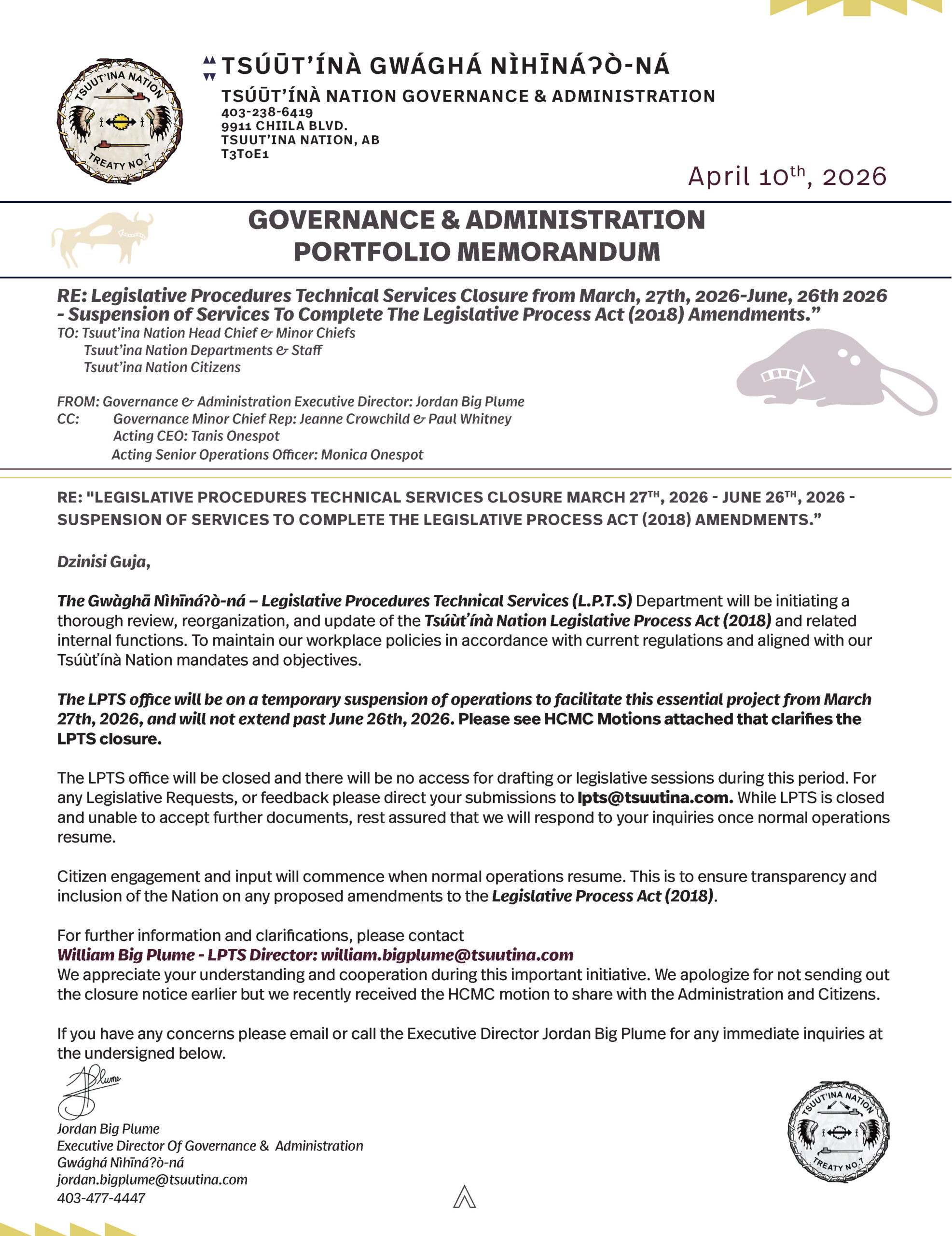 Dzīnísī gújā (Good day), Please see the attached memo regarding the Legislative Procedures Technical Services closure, from March 27th – June 26th, 2026, for ...