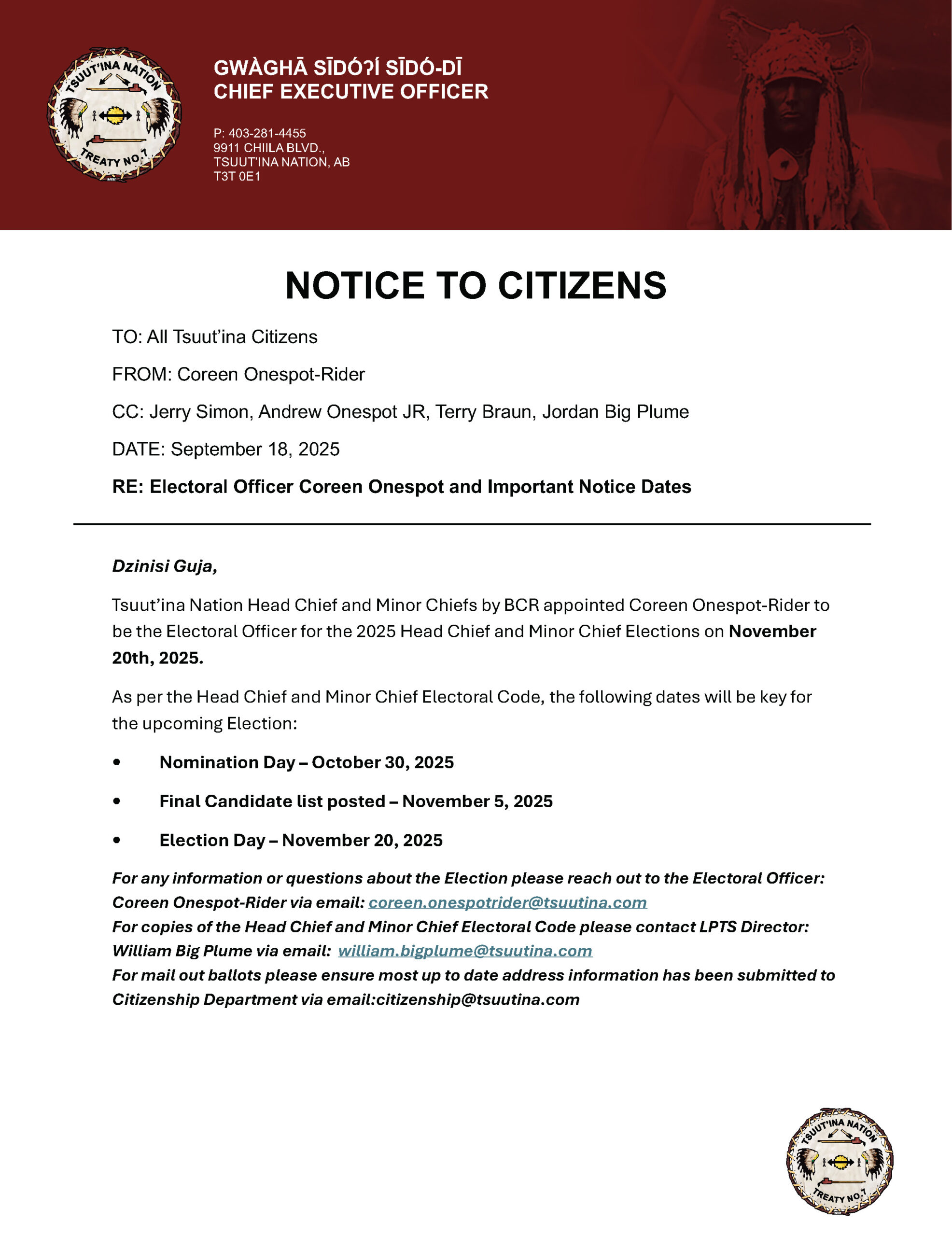 Gújá nágúdīgòy(Good morning), Please see the attached notice for the Electoral Officer, Coreen Onespot and Important Notice Dates. Candidate ...
