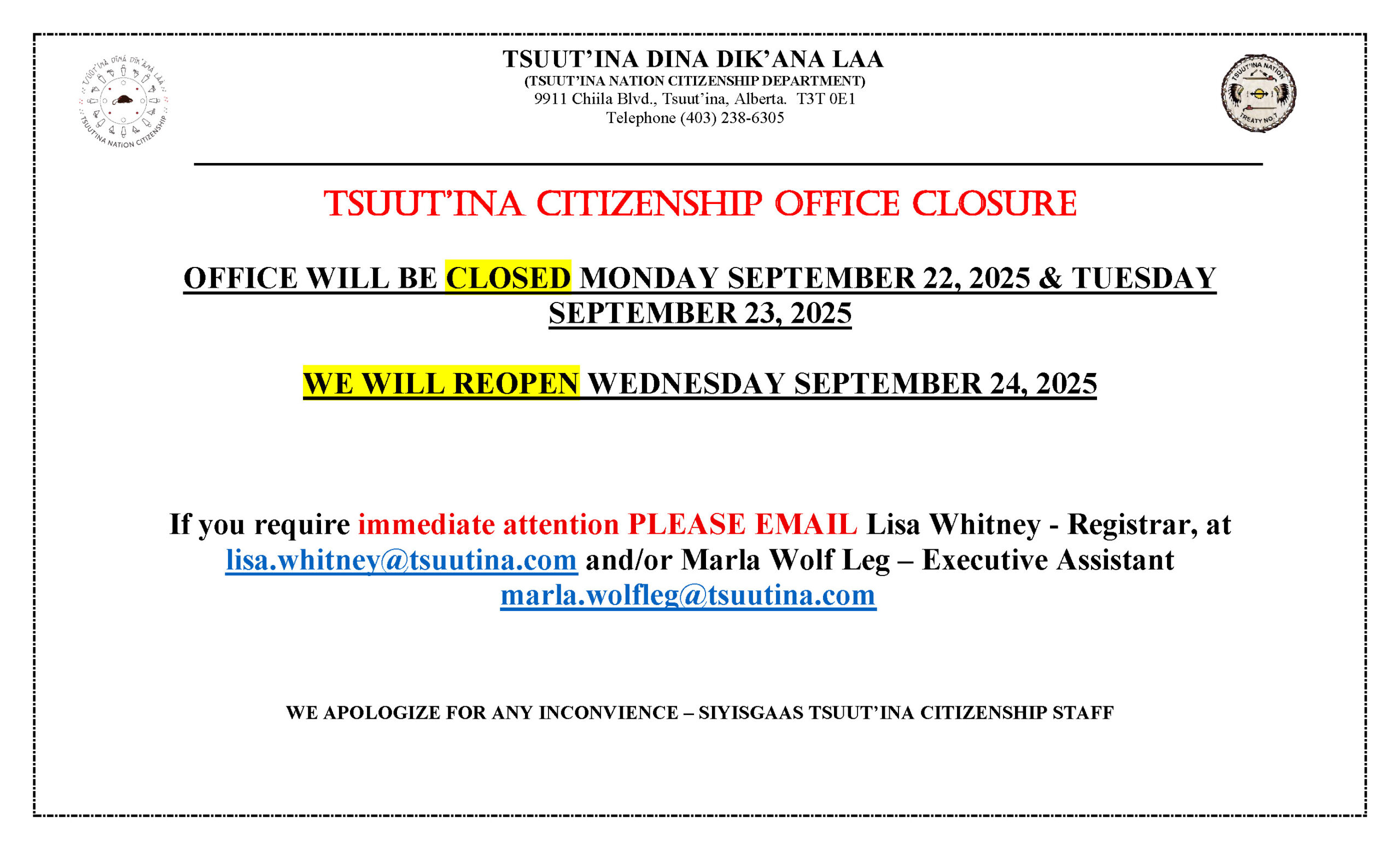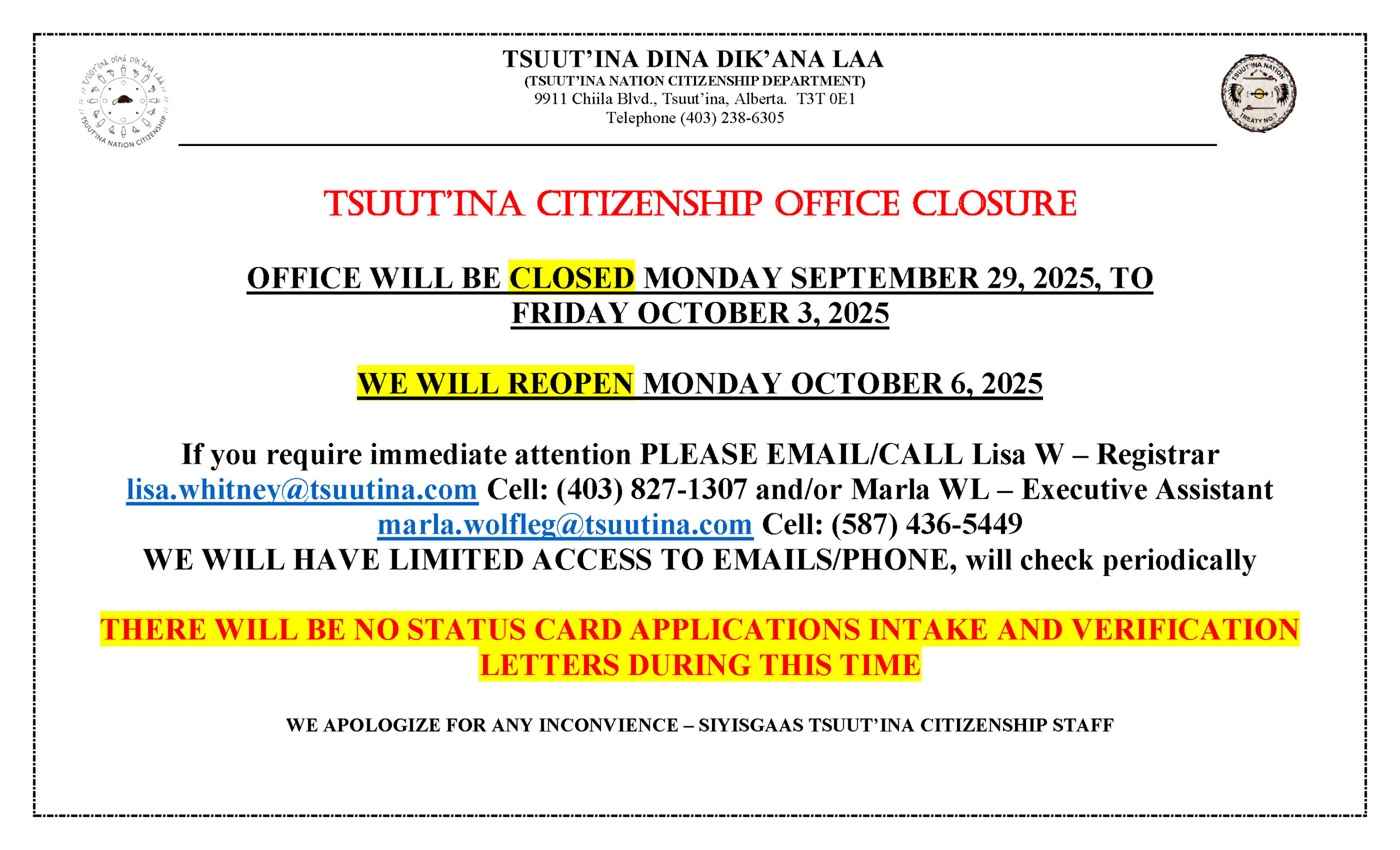 Dzīnísī gújā(Good day), Please be advised that the Citizenship Office will be closed on Monday, September 22nd, 2025 & Tuesday, September 23rd, 2025 ...