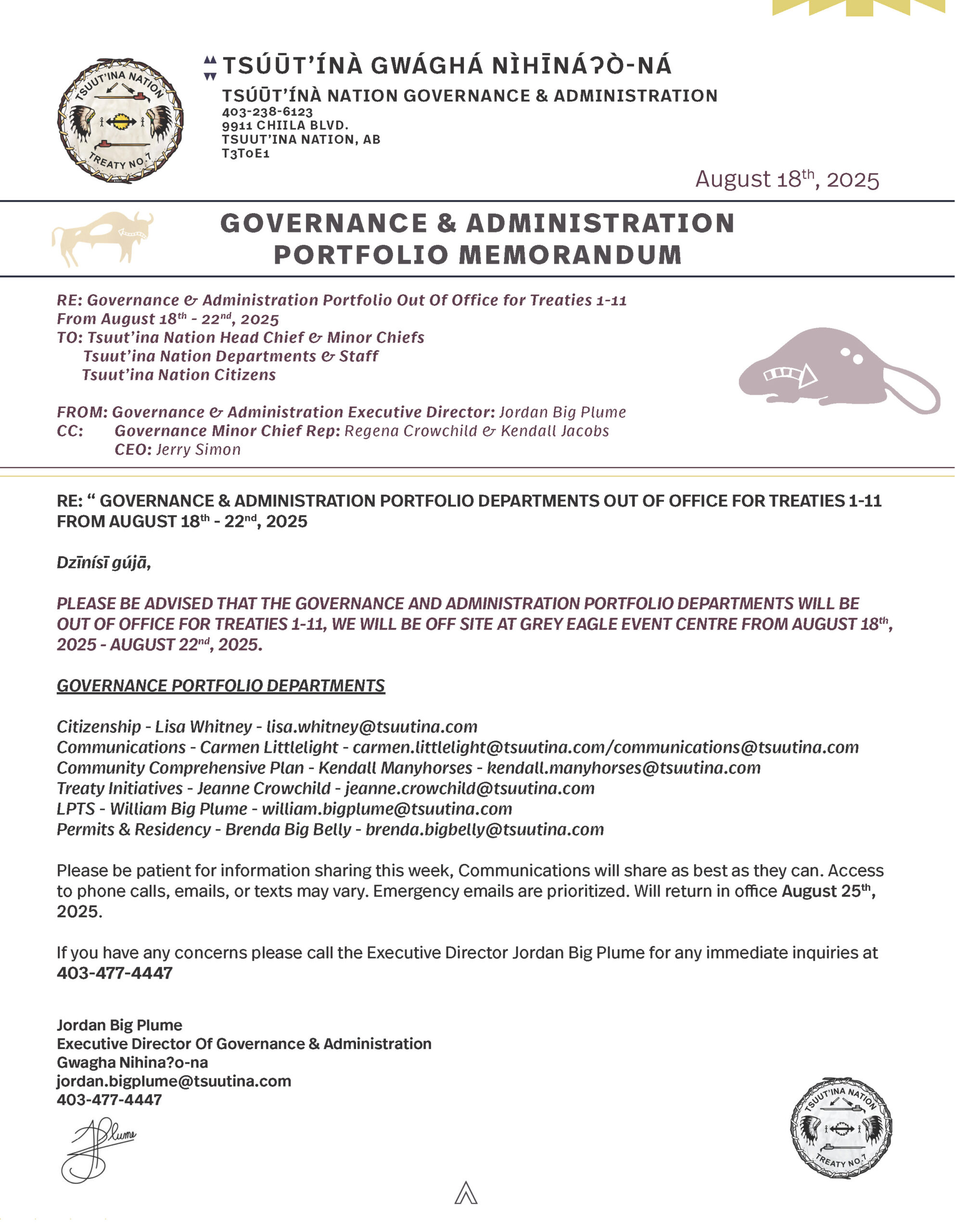 Gújá nágúdīgòy(Good morning), Please be advised that the Governance and Administration Portfolio Departments will be out of the office ...