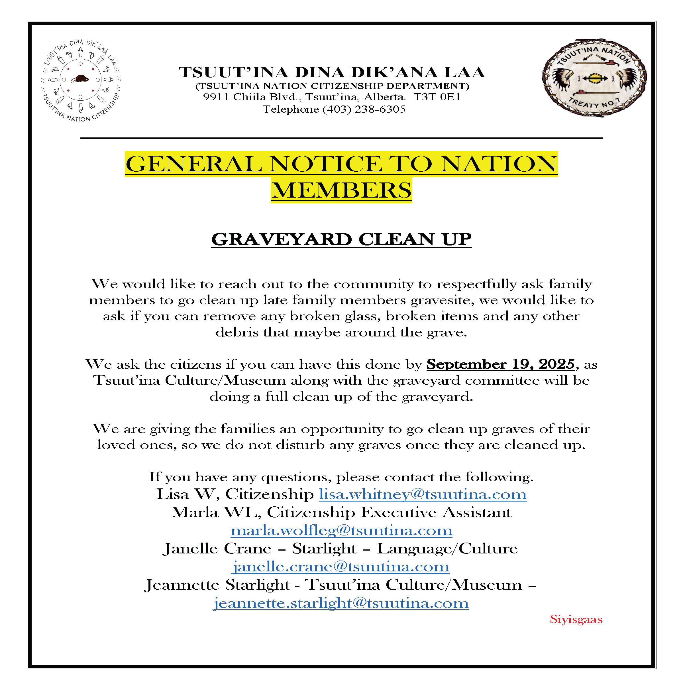 Gújá nágúdīgòy(Good morning), Please see the attached community notice regarding the graveyard clean-up on September 19th, 2025. Notice.GraveyardCleanup SEPT 19 2025 ...