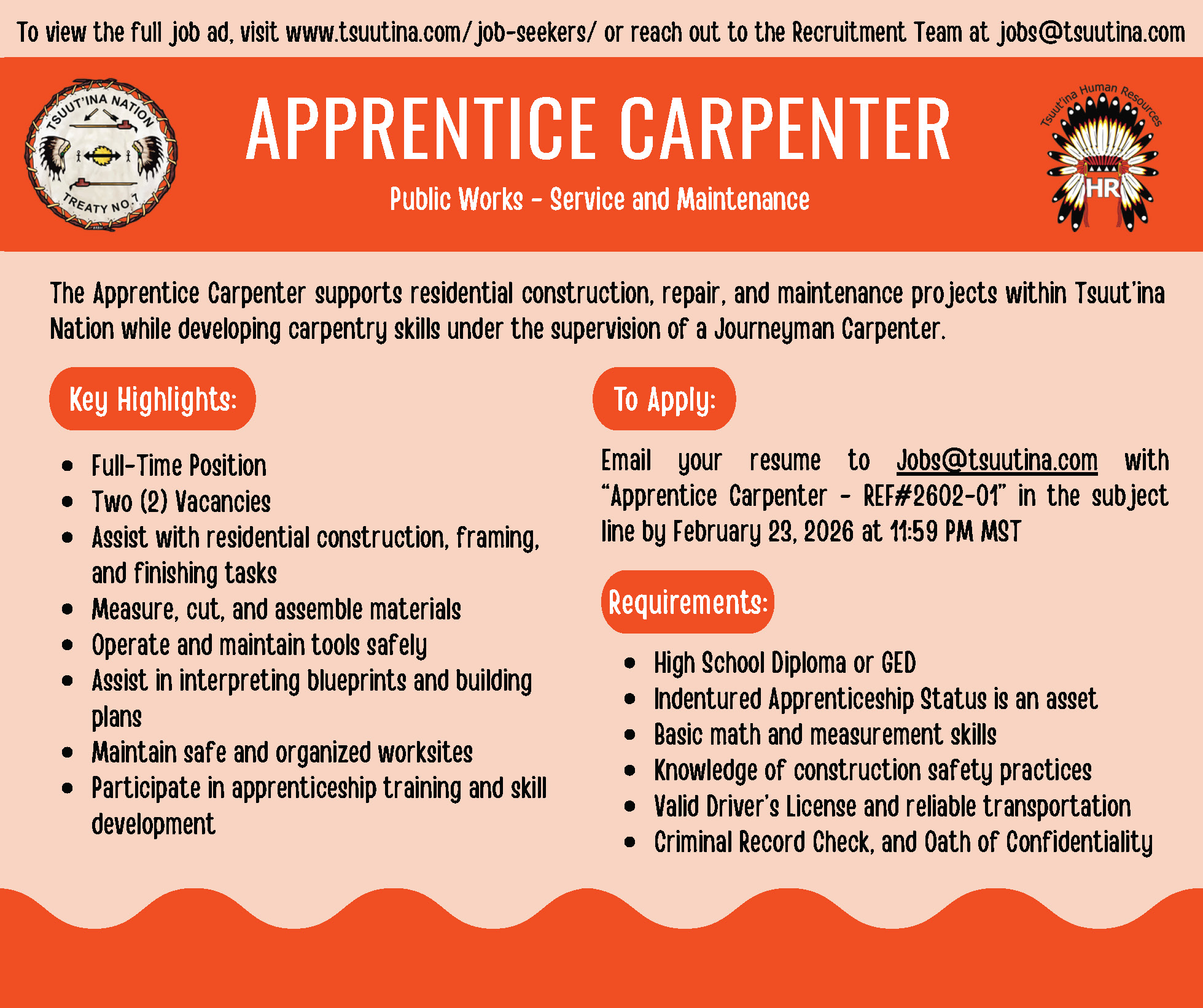 Dzīnísī gújā(Good day), Please see the attached position summary poster for employment opportunities with Tsuut’ina Nation Child and Family Services ...