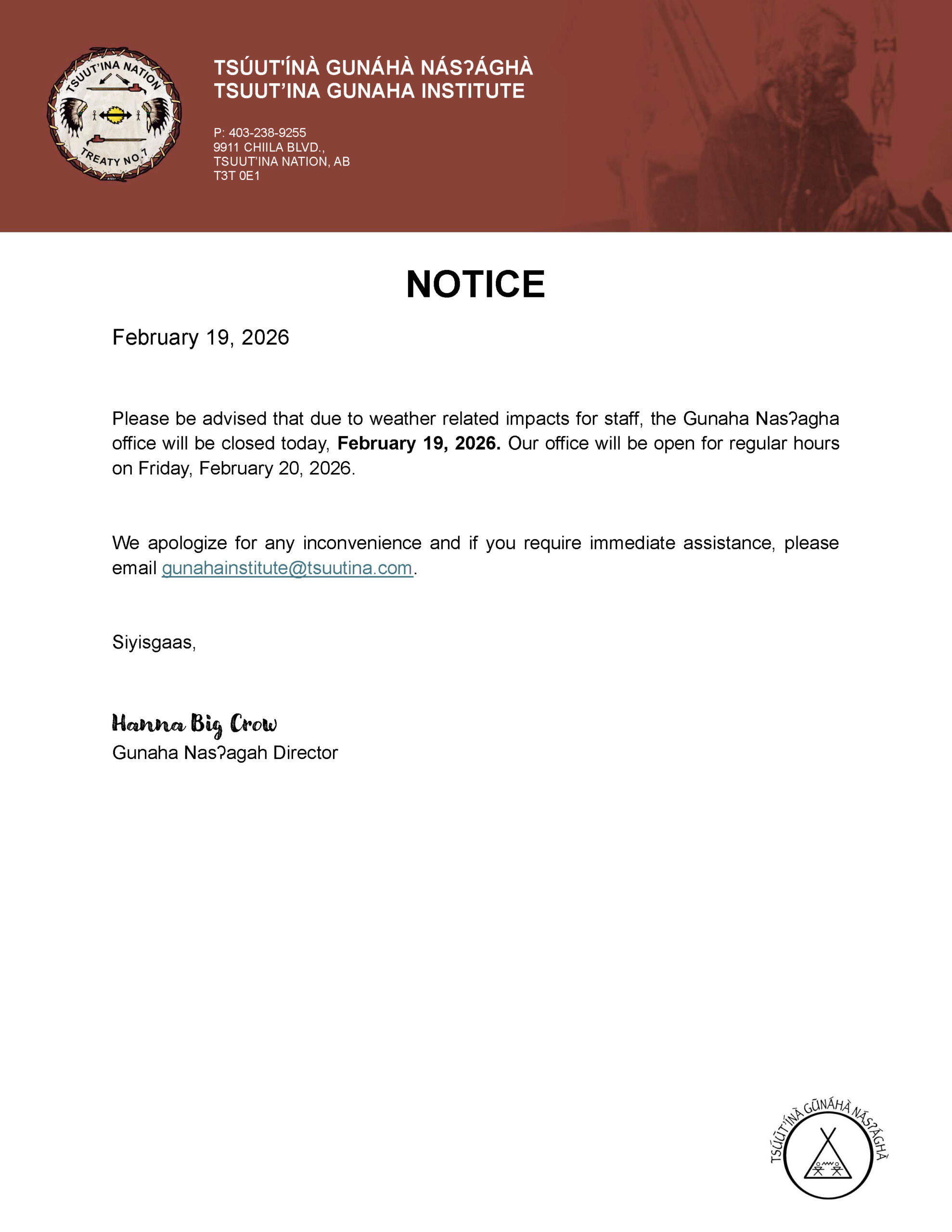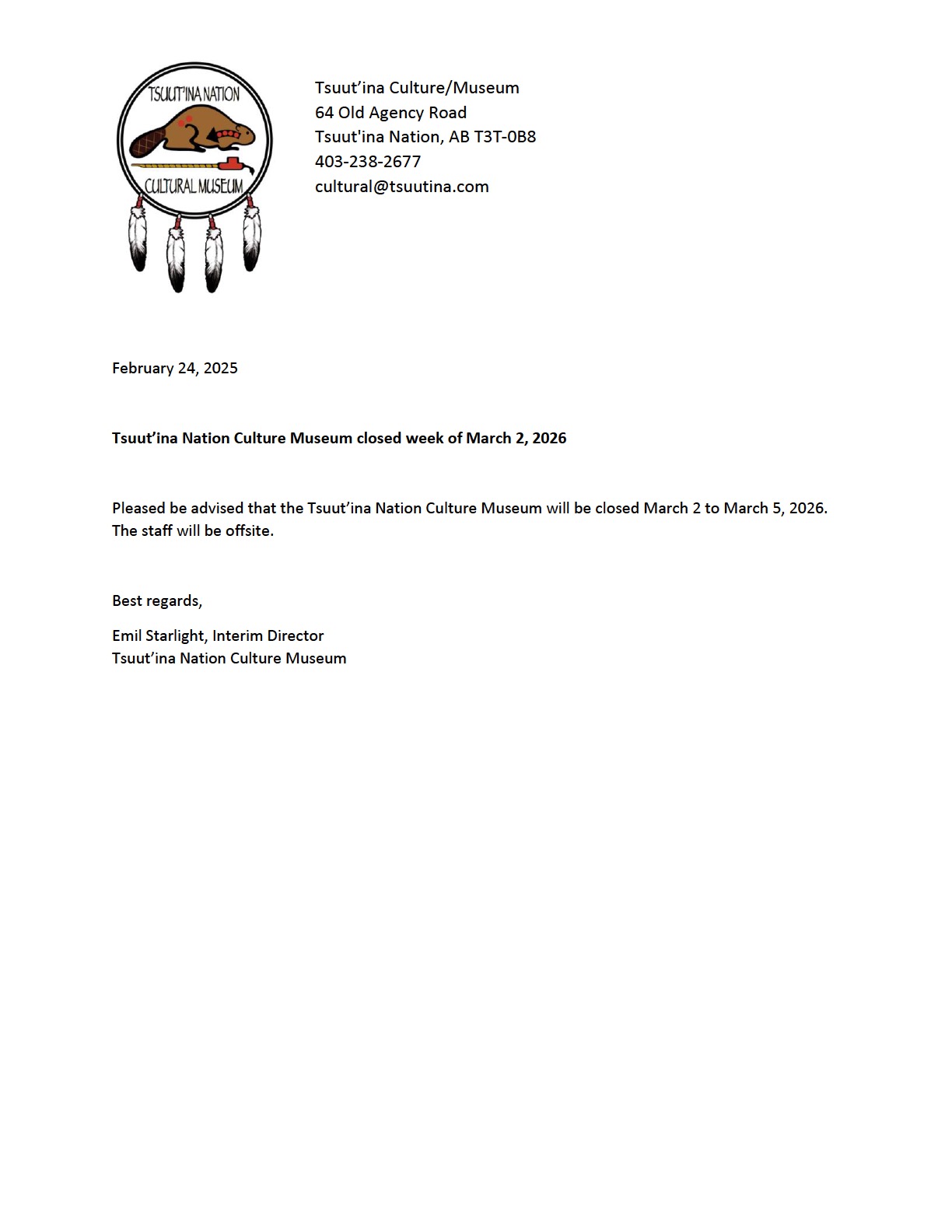 Diyí dzínisà Gújá nágúdīgòy (Good morning), Please be advised that the Tsuut’ina Nation Culture Museum will be closed ...