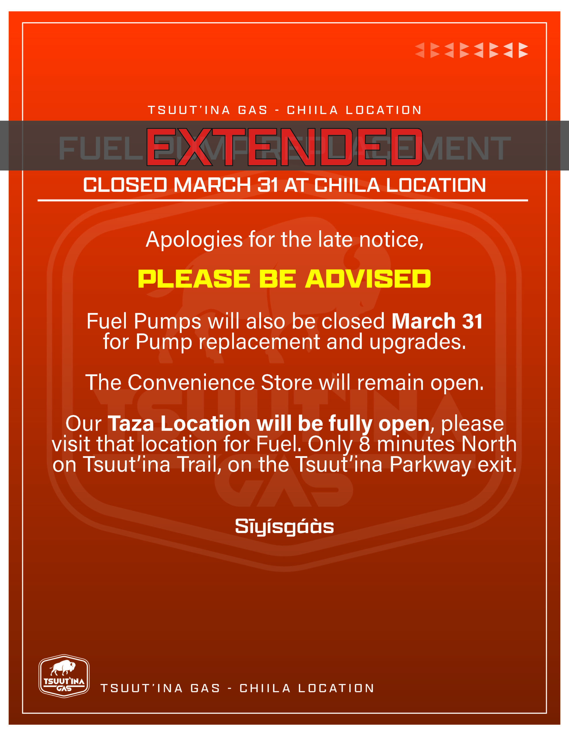 Tsuut’ina Gas Update – Fuel Pump Replacement & Upgrade March 30th, 2026 Dzīnísī gújā (Good day), Please be advised that the fuel pumps will also be closed on March 31st, 2026, for pump replacement and ... Learn More