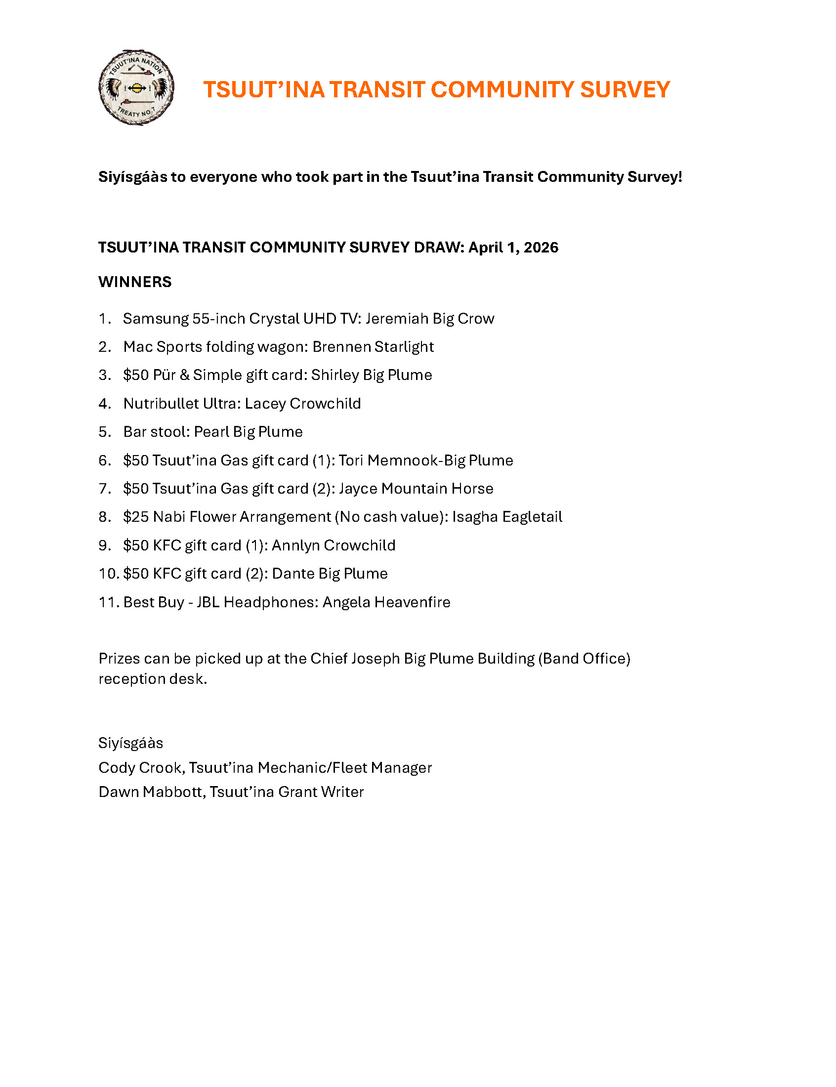 Tsuut’ina Transit Community Survey Draw Winners April 1st, 2026 Dzīnísī gújā (Good day), Please see the attached notice for the Tsuut’ina Transit Community Survey Draw Winners. 20260401_Tsuut’ina Transit Survey ... Learn More