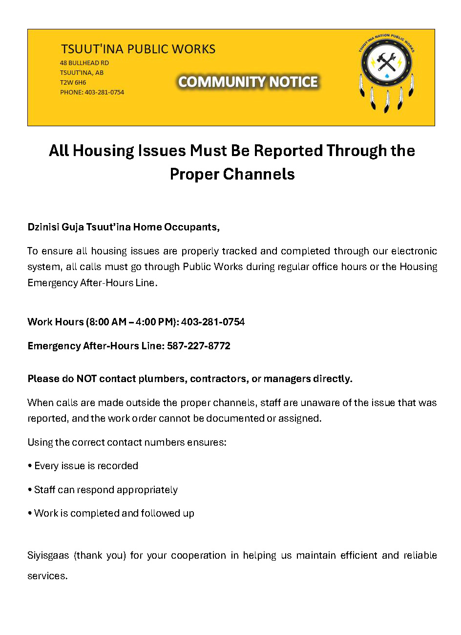 Dzīnísī gújā(Good day), Please see the attached notice and important reminder from Tsuut’ina Public Works. Proper Channels emergency line Work ...