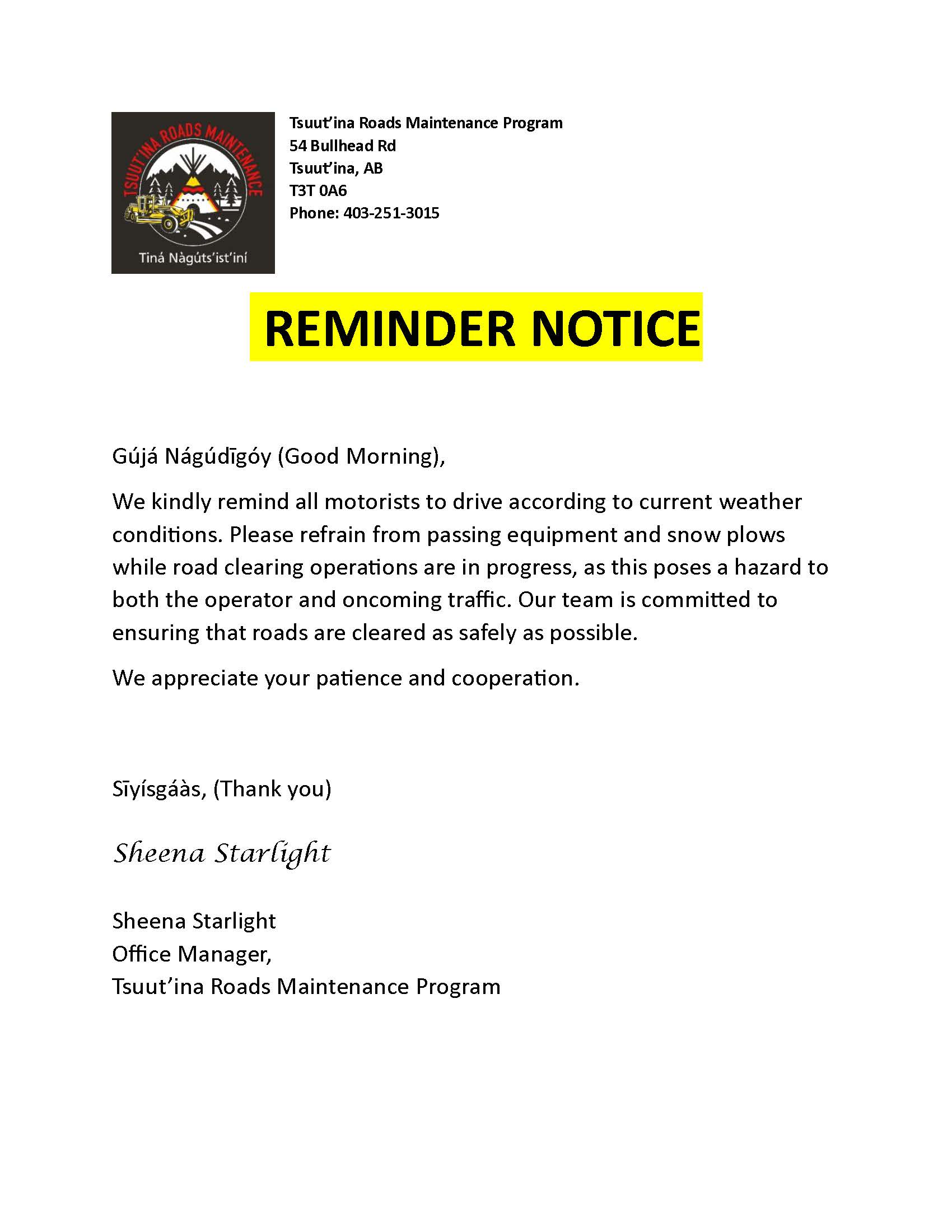 Gújá nágúdīgòy(Good morning), Please see the Roads Emergency Contacts below for any road-related concerns or snow clearing: Tsuut’ina ...