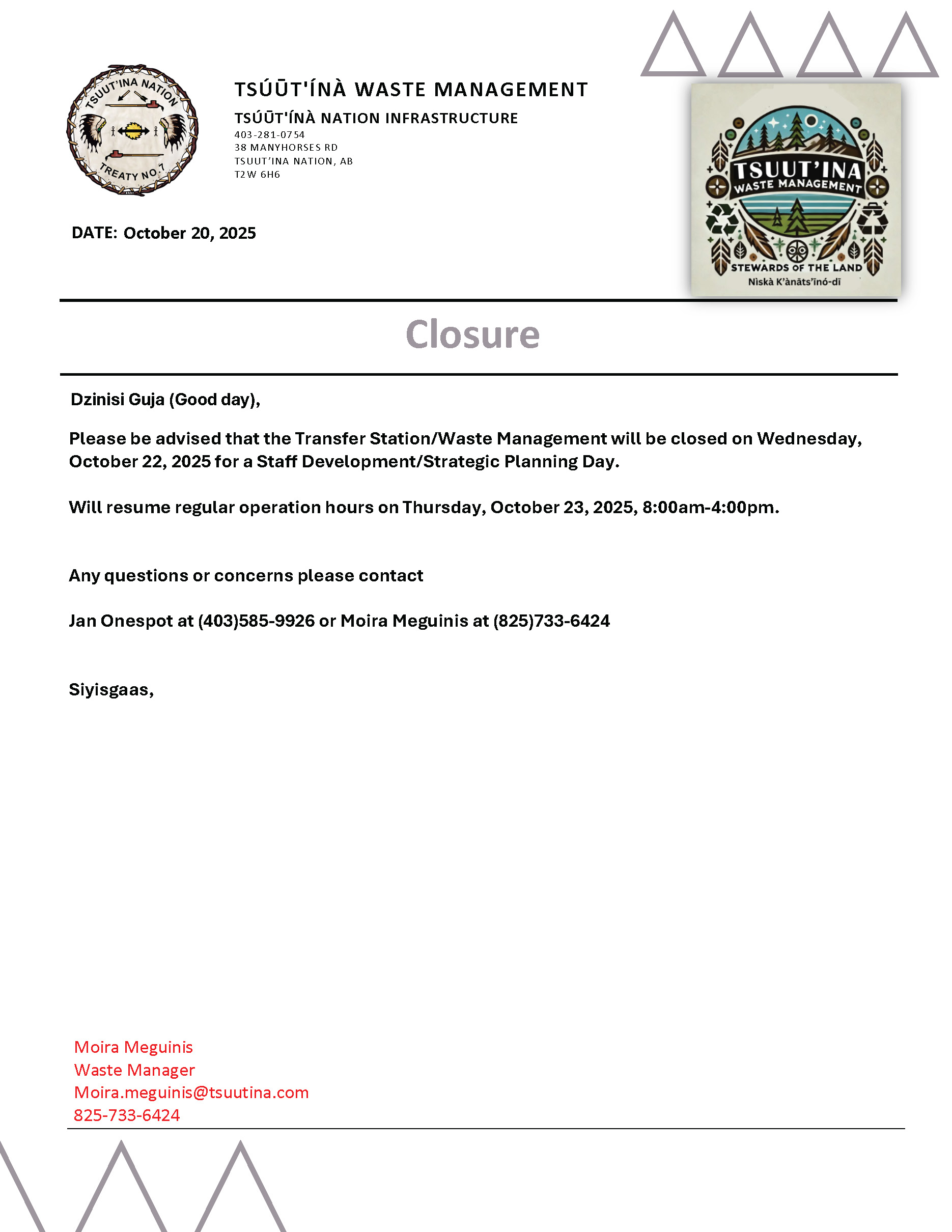 Gújá nágúdīgòy(Good morning), Please be advised that the Transfer Station/Waste Management will be closed on Wednesday, October 22, 2025, for ...