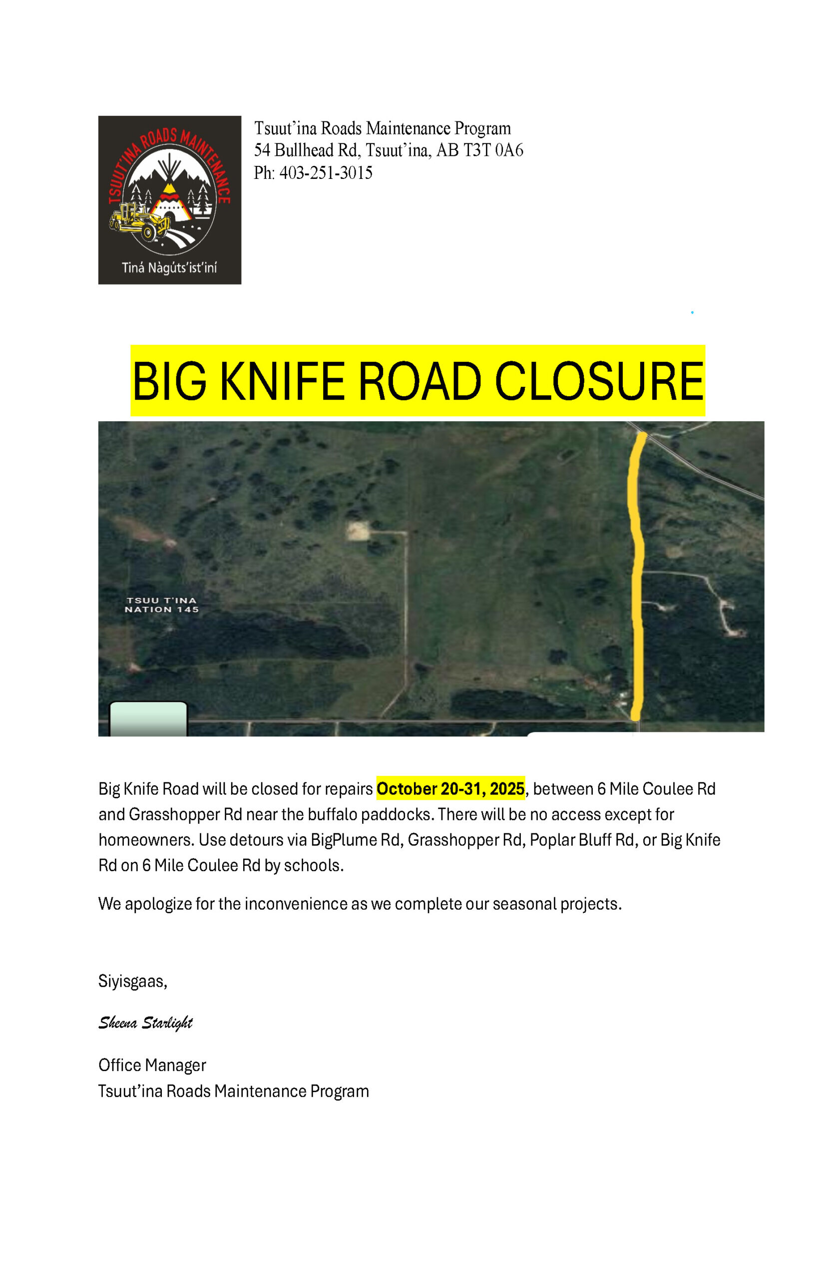Dzīnísī gújā(Good day), Please see attached notice for ongoing & upcoming lane closures on 6 Mile Coulee Road in Tsuut’ina. Sī...