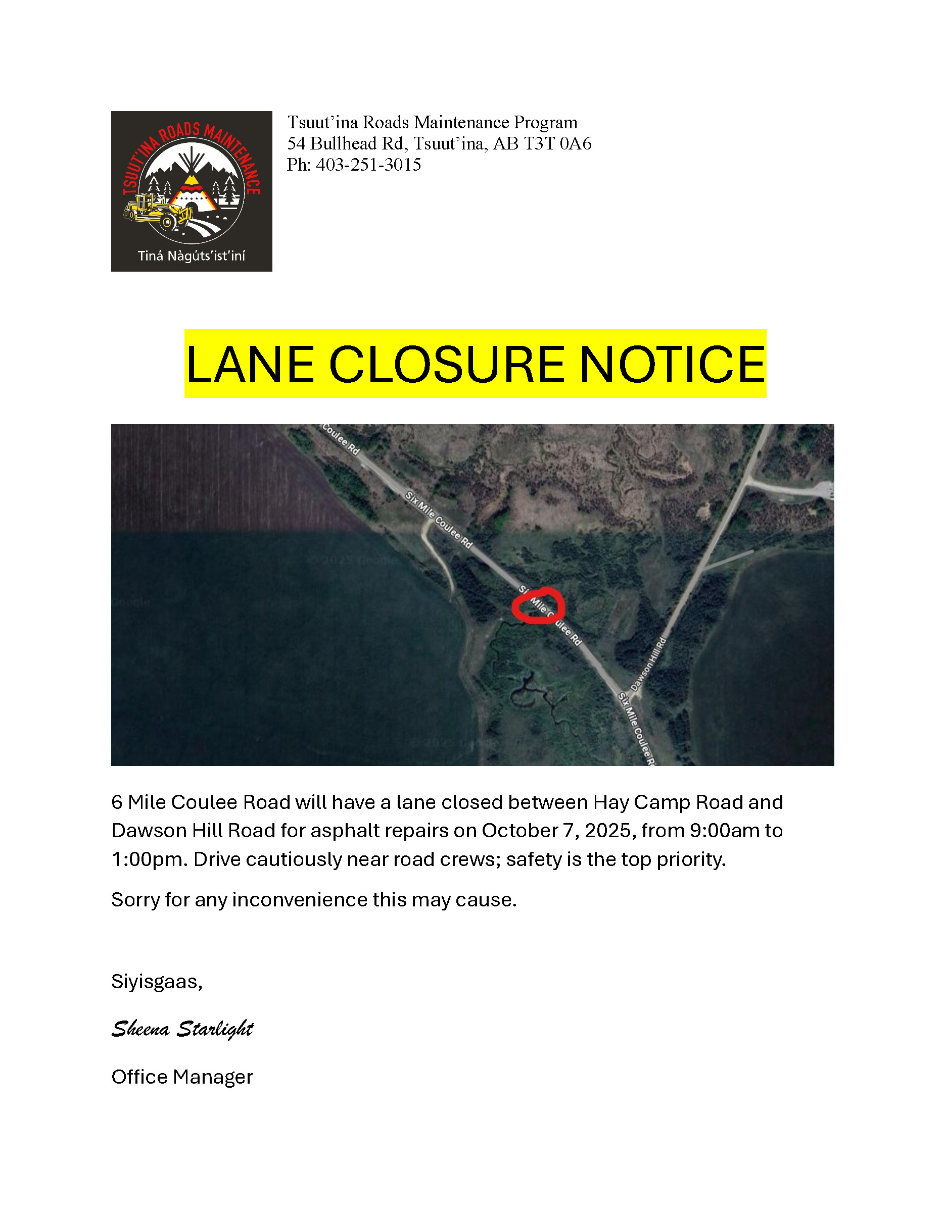 Dzīnísī gújā(Good day), Please see attached notice for ongoing & upcoming lane closures in Tsuut’ina. Sīyísgáàs(...