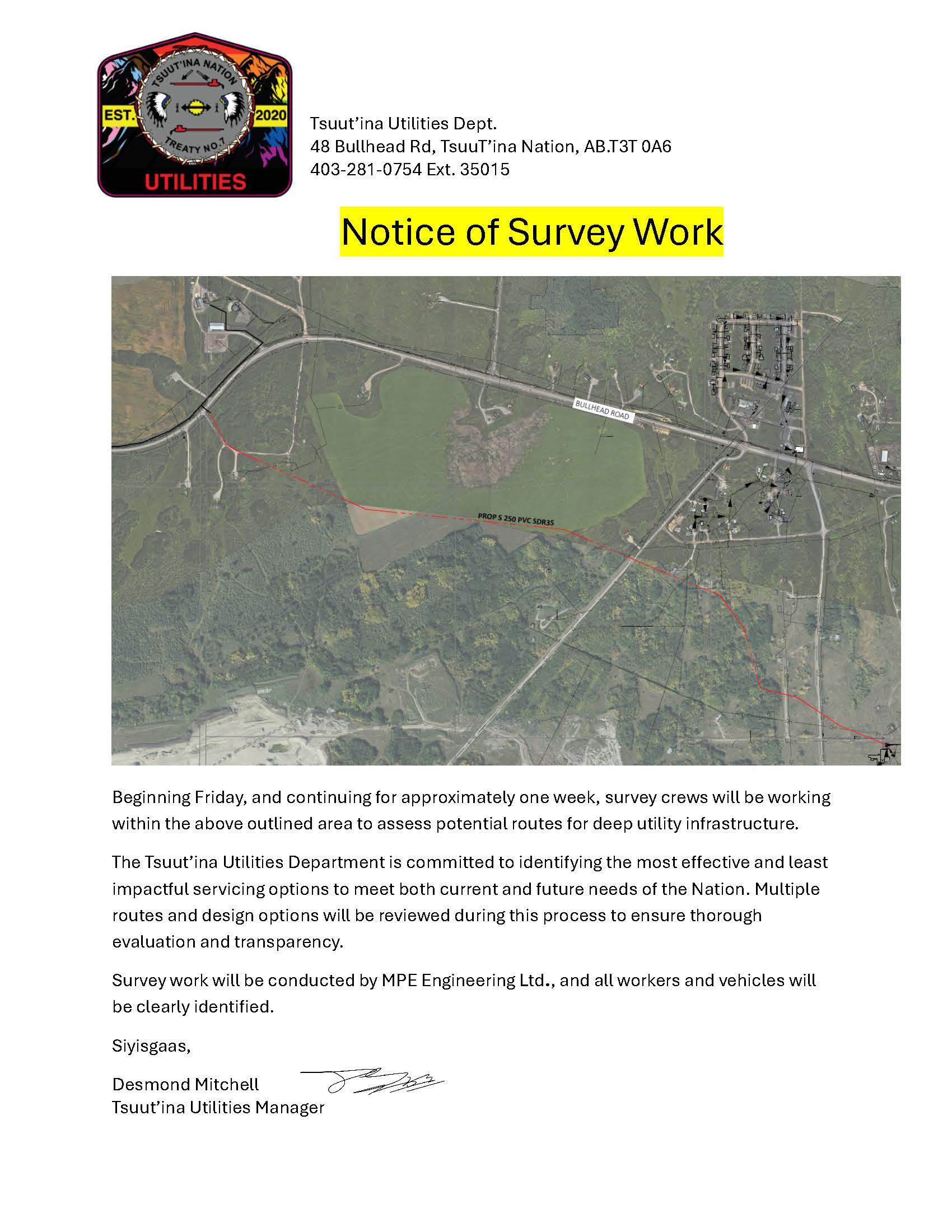 Dzīnísī gújā(Good day), Please see the attached poster from Tsuut’ina Nation Utilities Dept, Survey work is beginning this Friday. *Click ...