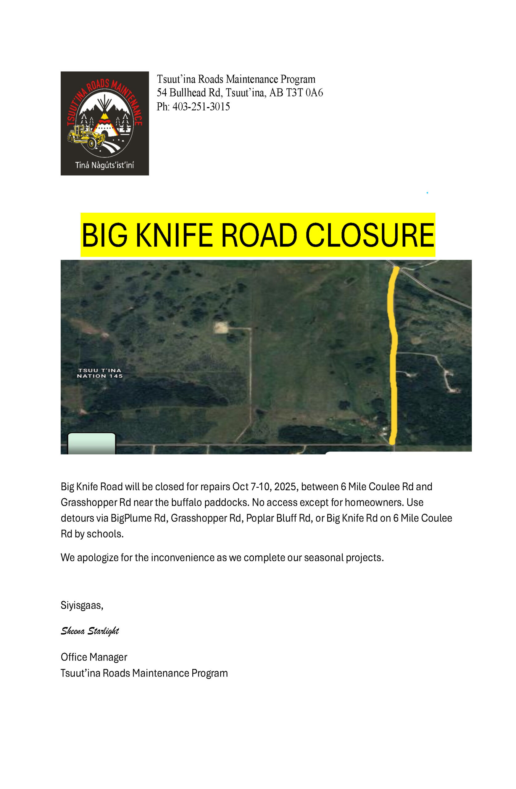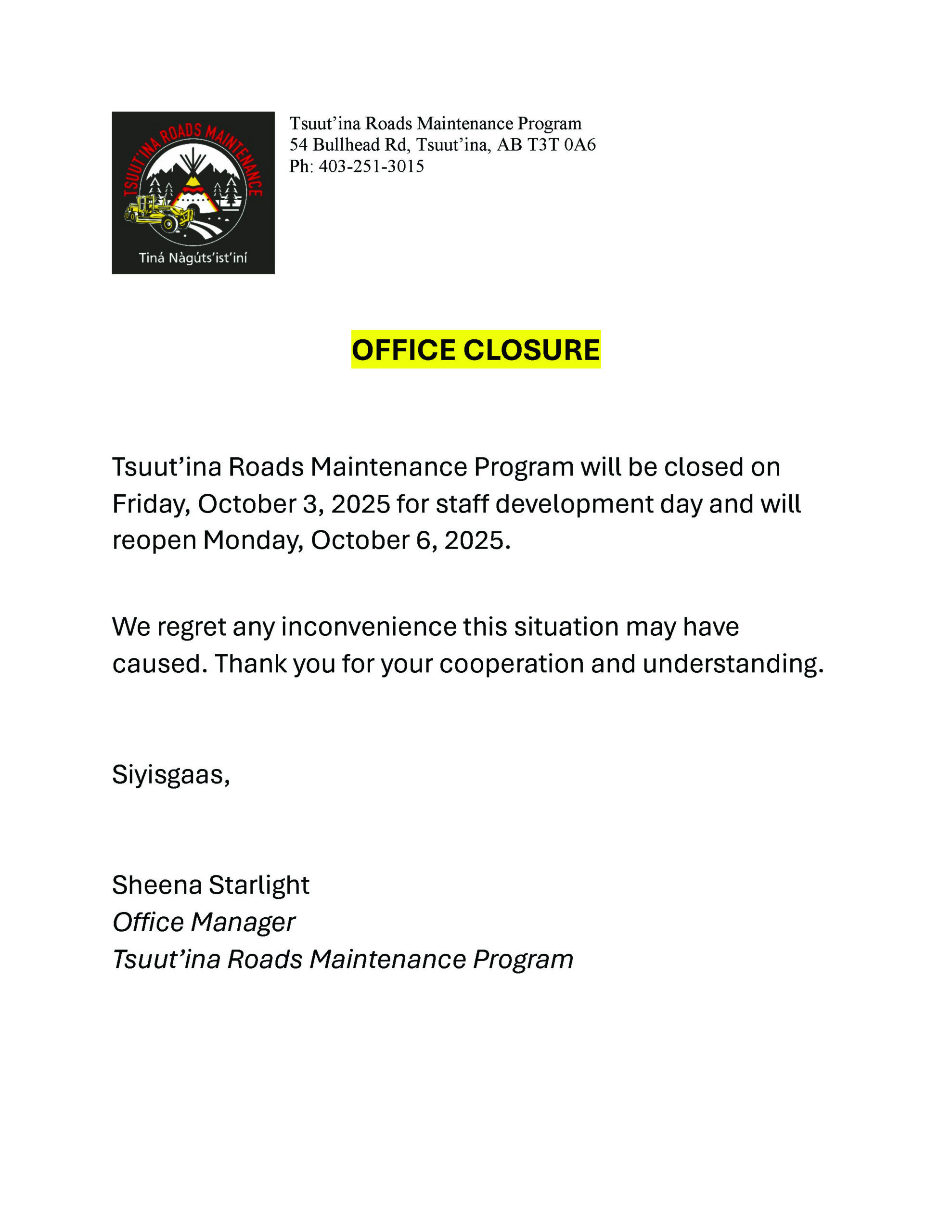 Dzīnísī gújā(Good day), Please be advised that the Tsuut’ina Roads Maintenance Program will be closed on Friday, October 3rd, 2025 for ...