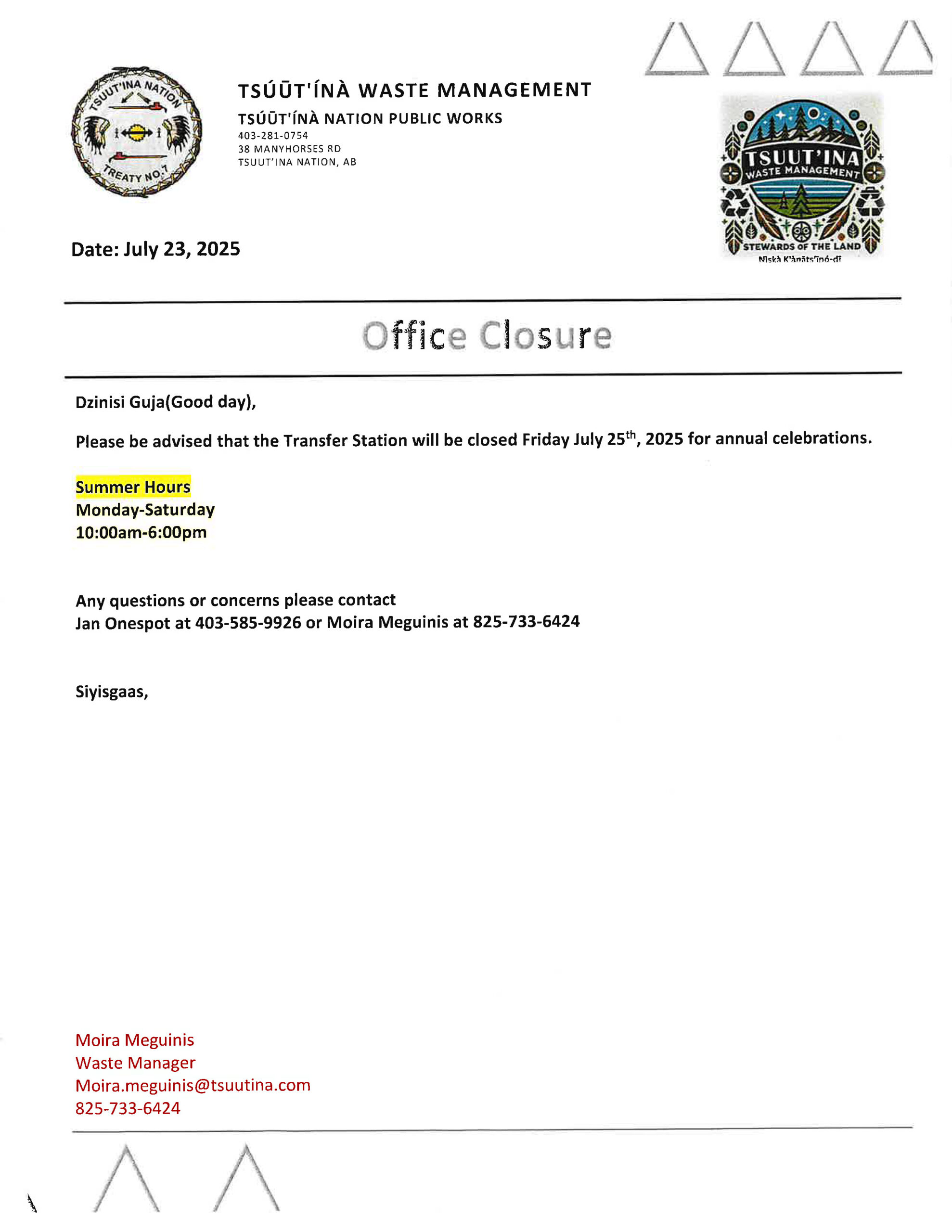 Dzīnísī gújā(Good day), Please see the attached notice regarding the Transfer Station office closure on Friday, July 25th, 2025. Transfer station annual ...