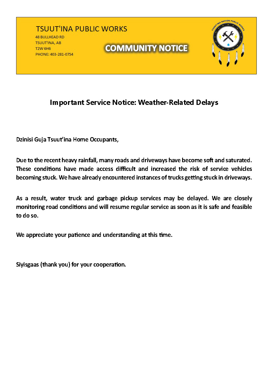 Dzīnísī gújā(Good day), Please see the attached notice from Tsuut’ina Public Works regarding weather-related delays. Truck Service Delay notice Sī...