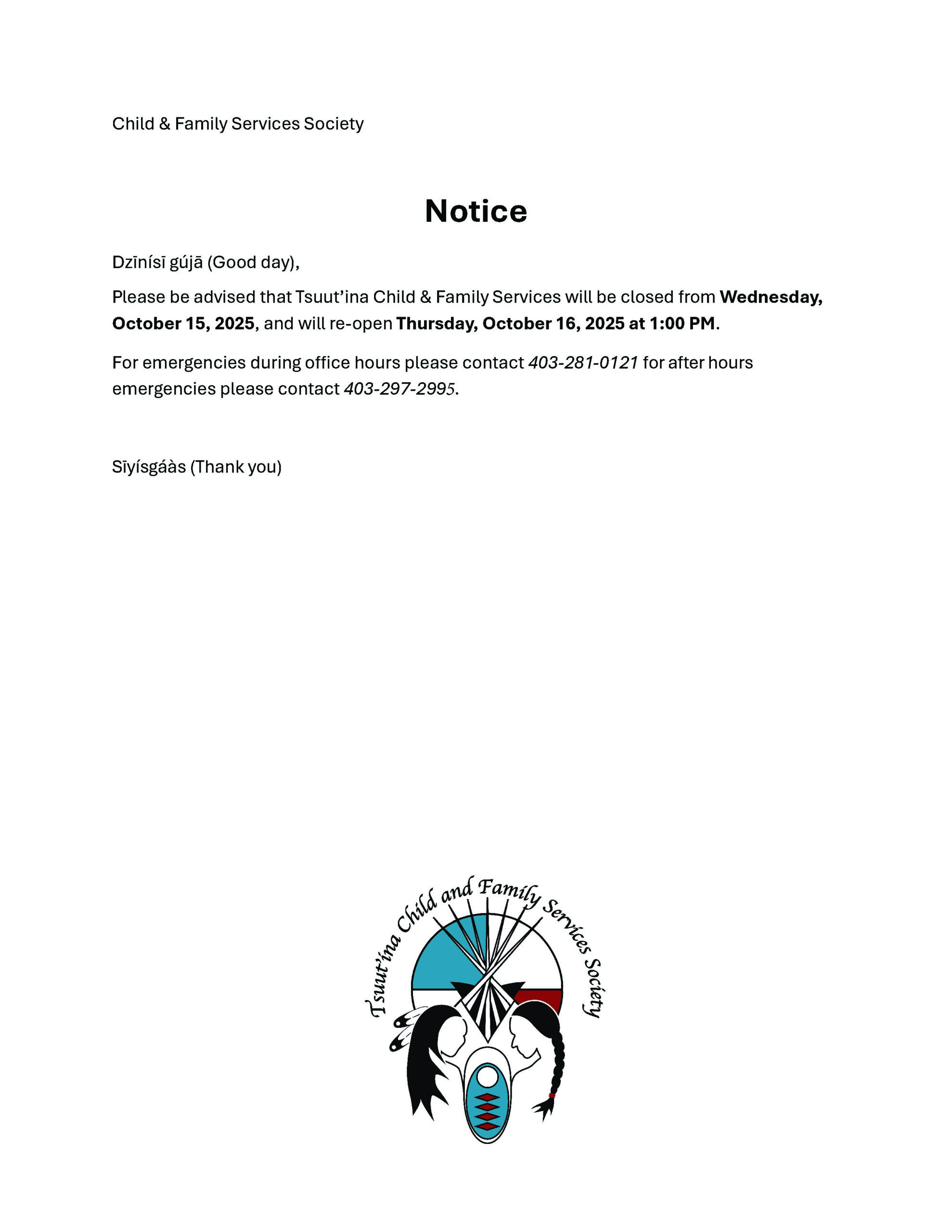 Gújá nágúdīgòy(Good morning), Please be advised that Tsuut’ina Nation Child & Family Services will be closed on Thursday, ...