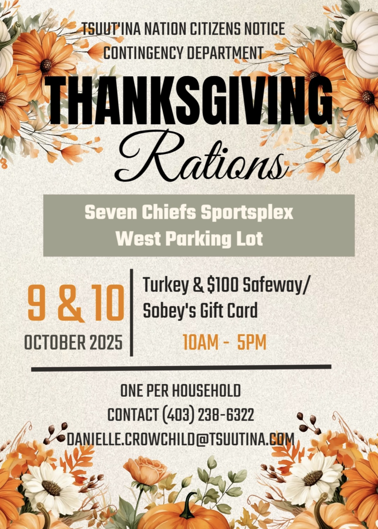 Dzīnísī gújā(Good day), Please see the attached poster for Thanksgiving Rations happening on October 9th & 10th, 2025, from 10 AM – 5 PM at ...