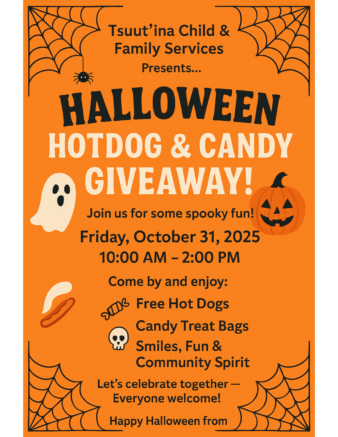 Dzīnísī gújā(Good day), Please see the attached poster for the Halloween Hotdog & Candy Giveaway. Tsuut’ina Child and Family Services ...