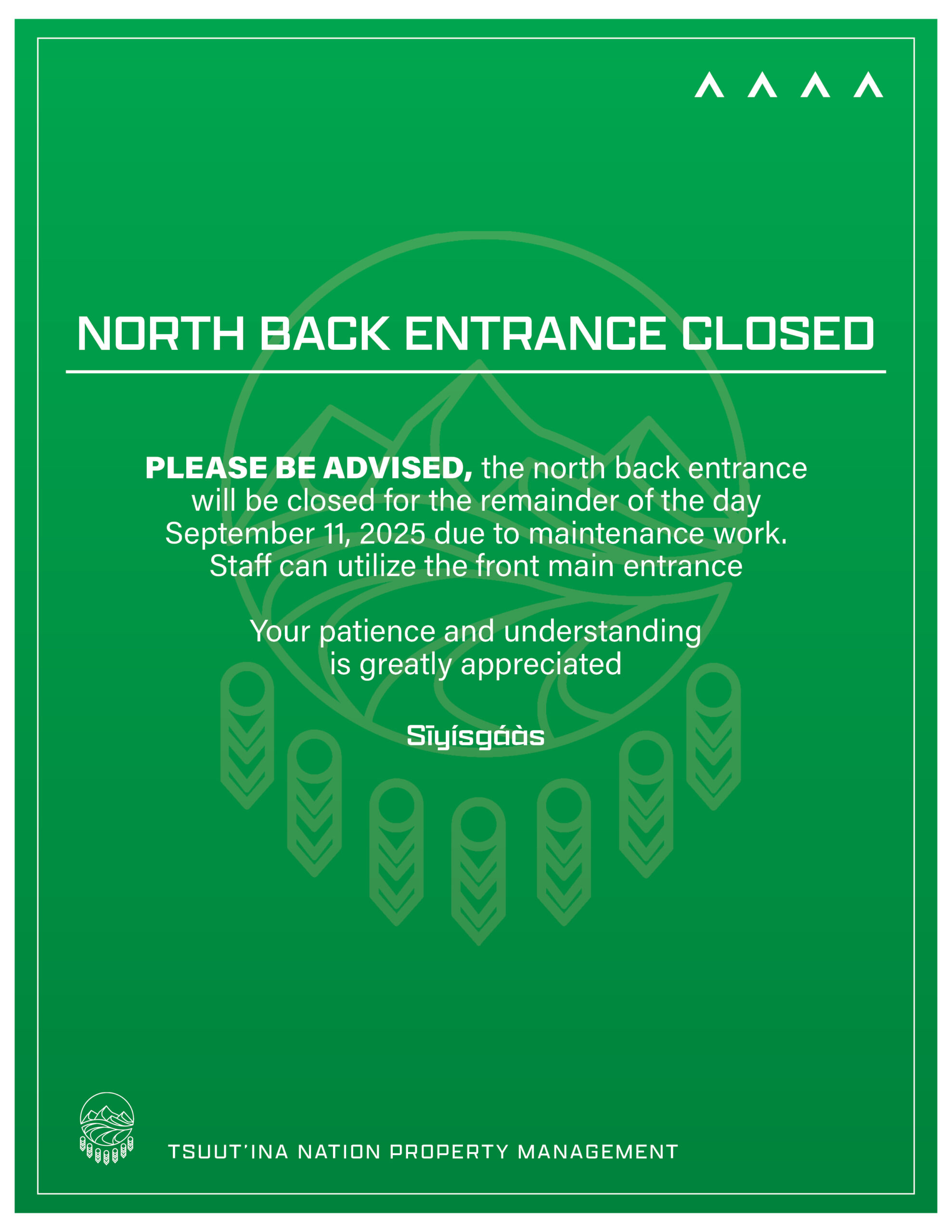 Dzīnísī gújā(Good day), Please be advised that the north back entrance will be closed for the remainder of the day, September 11, 2025, ...