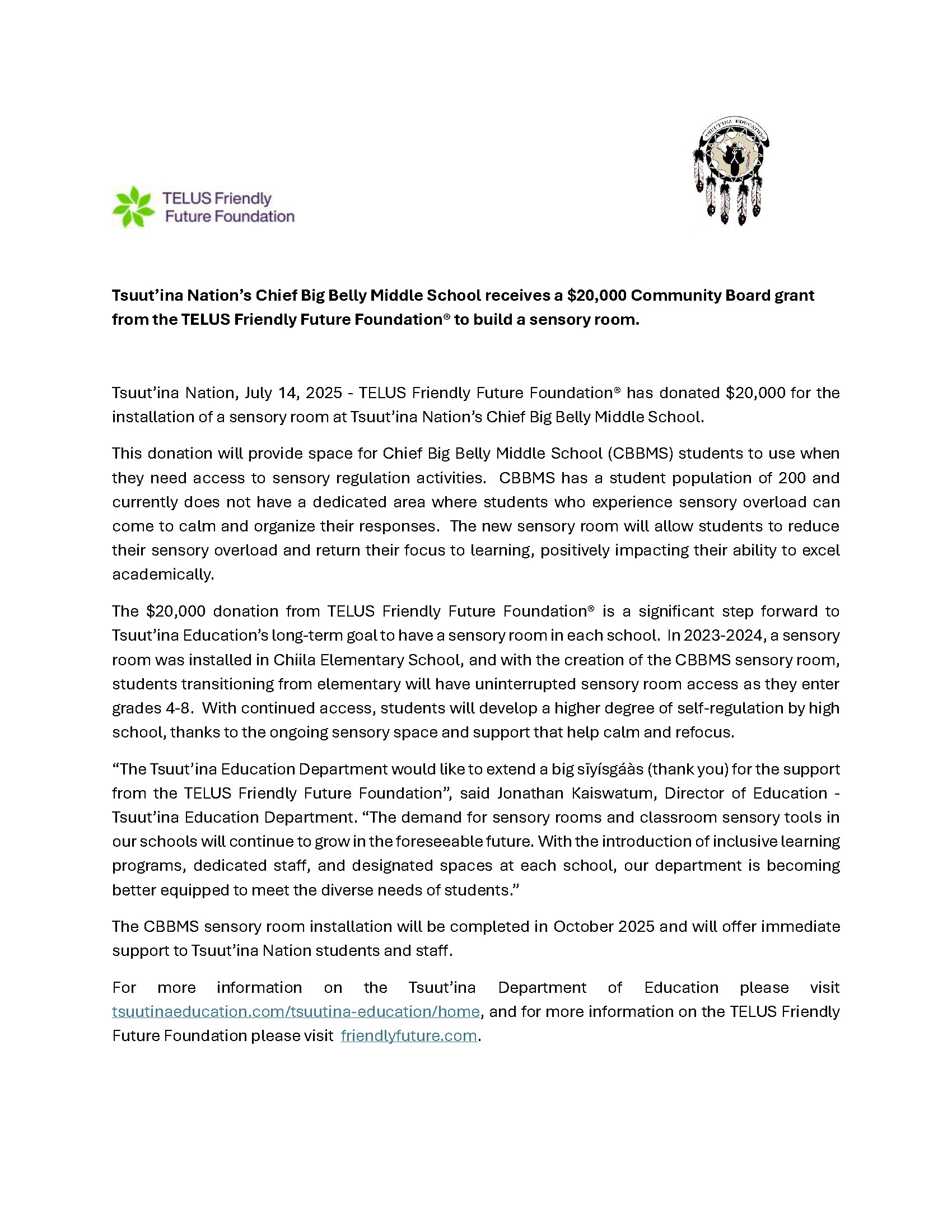 Gújá nágúdīgòy(Good morning), Please see the attached announcement for Tsuut’ina Nation’s Chief Big Belly Middle School $20,000 Community ...