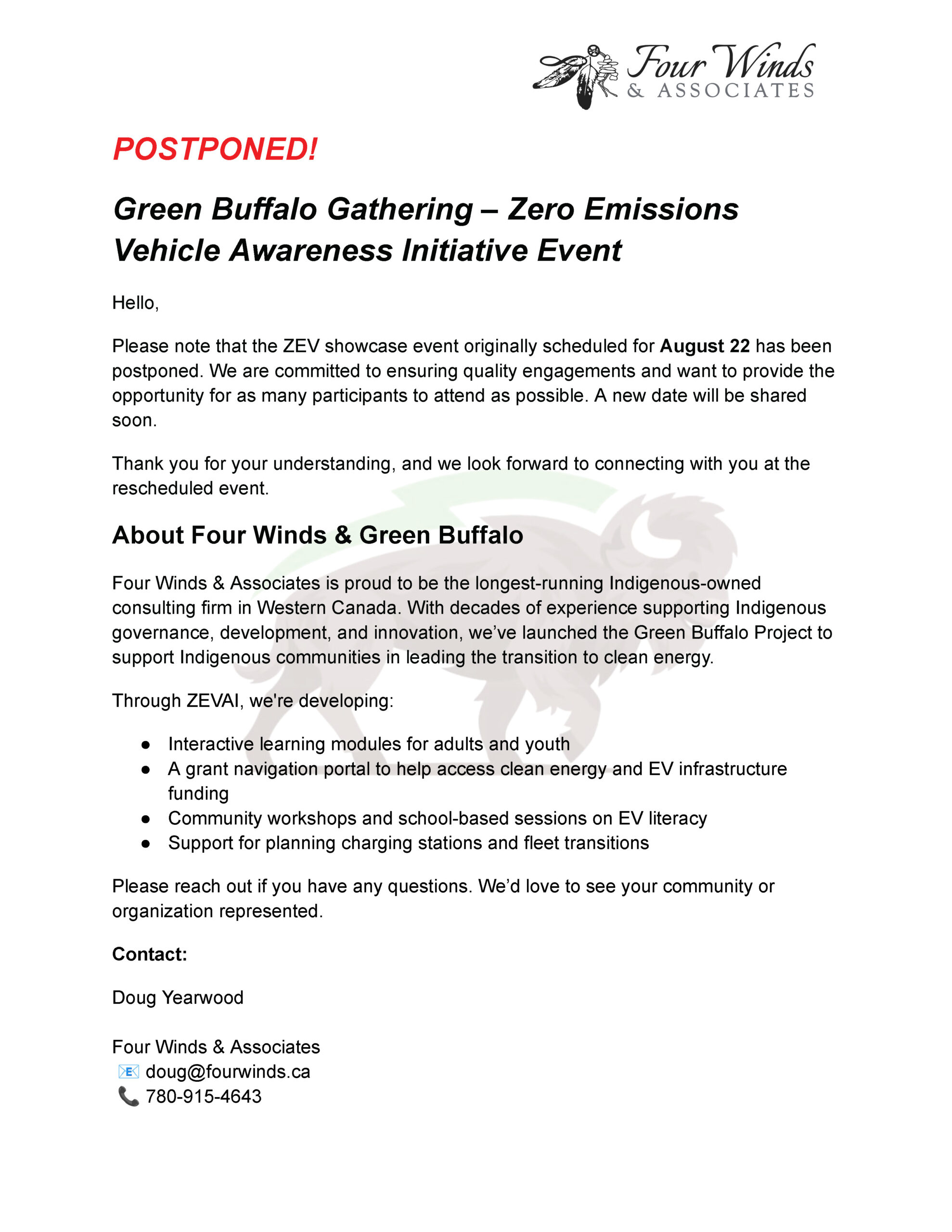 Gújá nágúdīgòy(Good morning), Please see the attached notice of postponement for the Calgary Showcase & Green Buffalo Community Event. ...