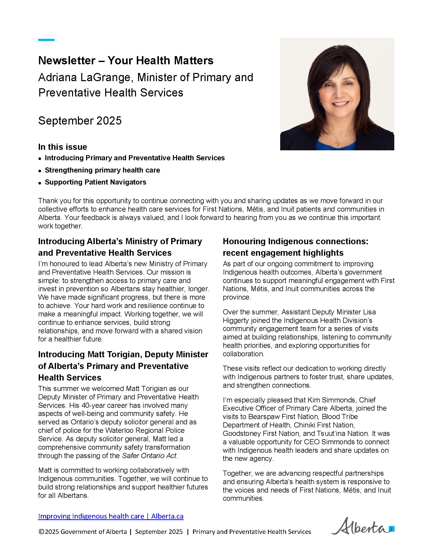 Gújá nágúdīgòy(Good morning), Please see the attached Alberta Health Newsletter. Minister Newsletter – Issue 5 Sept 2025 Sīyísgáàs(...