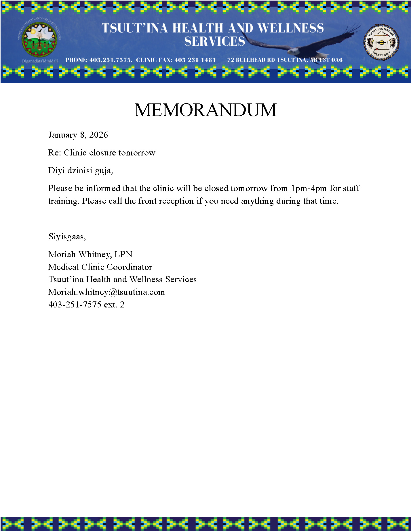 Dzīnísī gújā(Good day), Please be advised that the Clinic will be closed on Friday, January 9th, 2026, from 1 PM – 4 PM for staff ...