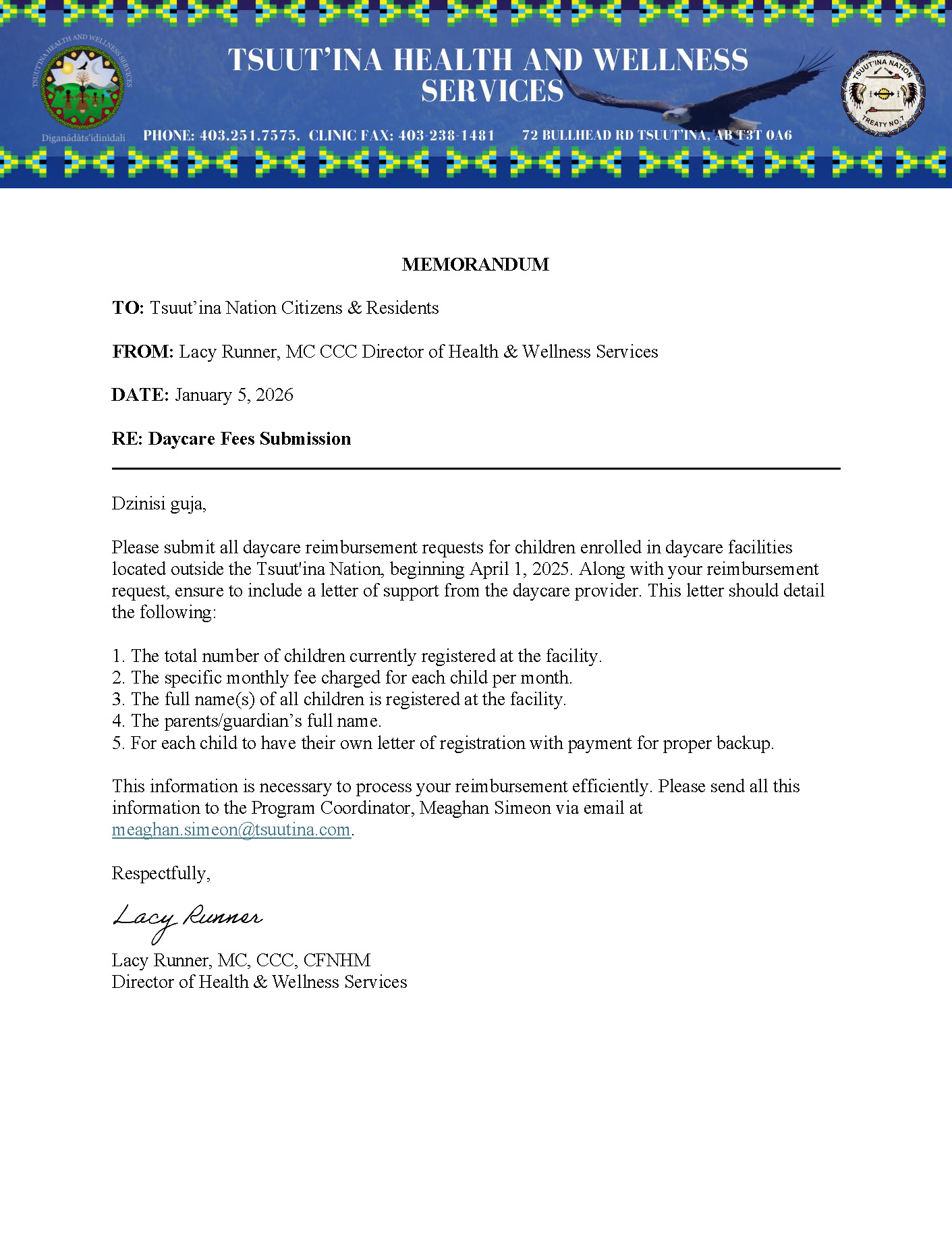 Dzīnísī gújā(Good day), Please see the attached memo from Tsuut’ina Health and Wellness Services regarding Daycare Fees Submission. Daycare Memo ...