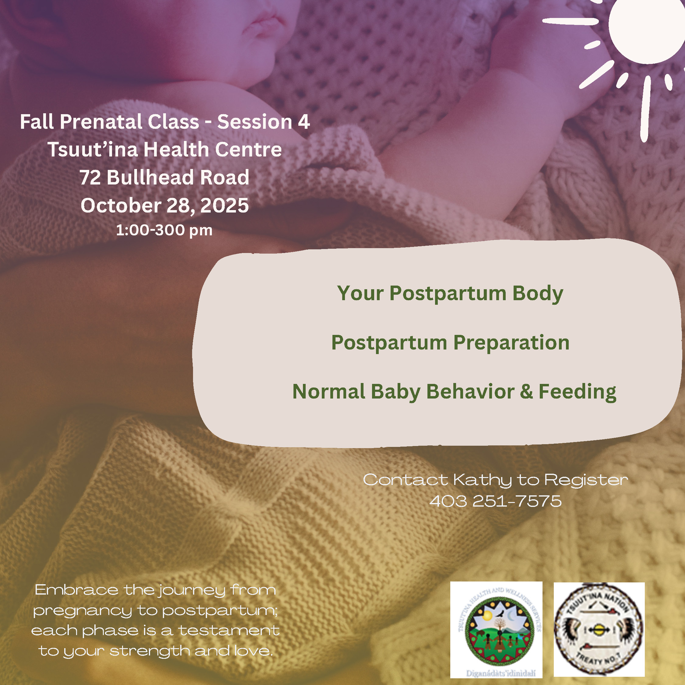 Gújá nágúdīgòy(Good morning), Please see the attached poster for the Fall Prenatal Class – Session 4, taking place on Tuesday, October 18...