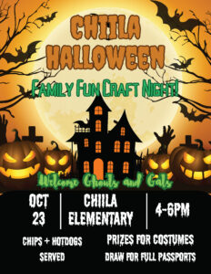 Please see the attached poster for the Chiila Elementary Halloween Craft Night happening on October 23rd, 2025, from 4 – 6 PM at the Chiila Elementary School.