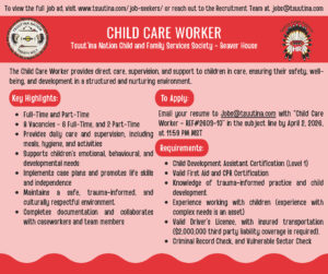 Please see the attached poster for the Child Care Worker – Position Summary.