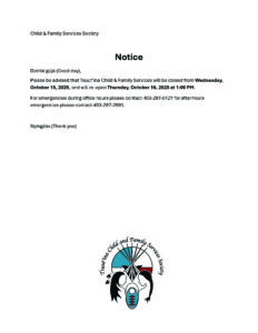 Please be advised Child & Family will be closed Wednesday, October 15th, and will reopen Thursday, October 16th, 2025, at 1 PM. For emergencies, please call 403-281-0121 and after hours 403-297-2995.